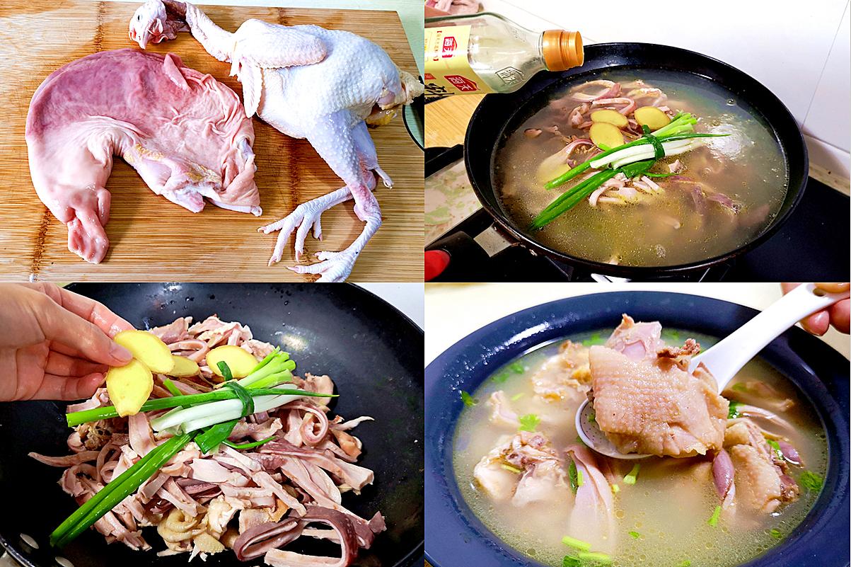2. 清洗處理:豬肚用粗鹽和醋反覆搓洗去除黏液,雞肉切塊,兩者均焯水備用。