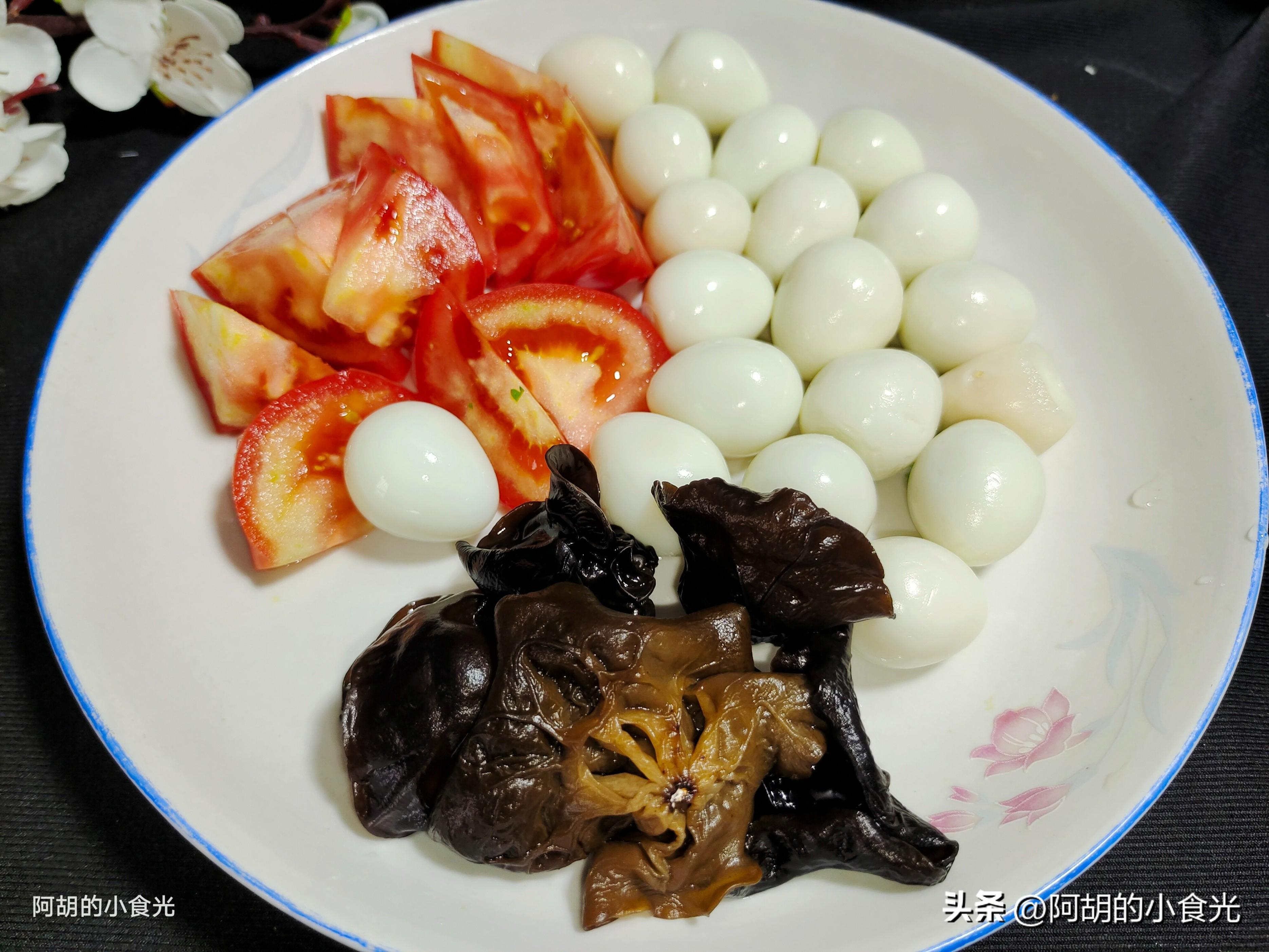第四步:準備的輔料有西紅柿一個切塊,煮熟的鵪鶉蛋適量,少許的幹木耳泡發後備用。再準備一個湯碗,碗中撒入多一些的白胡椒粉,再來一些陳醋和芝麻香油攪拌均勻,再撒入一些香菜碎備用。