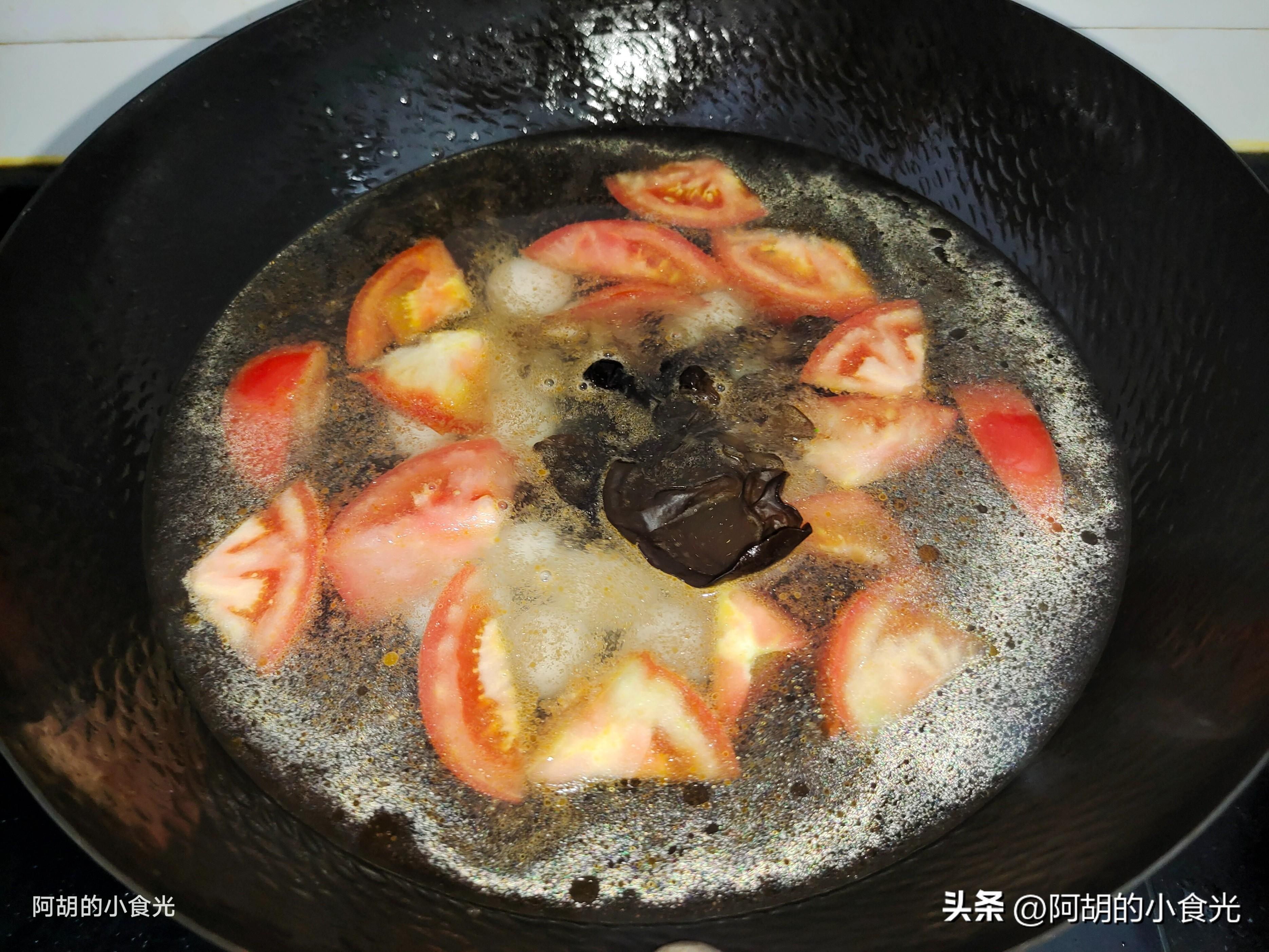 第五步:鍋燒熱,淋入少許的花生油燒熱,直接將西紅柿塊倒入鍋中炒一炒,而後衝入適量的開水,再將鵪鶉蛋、木耳等一塊倒入鍋中,保持大火煮一煮。