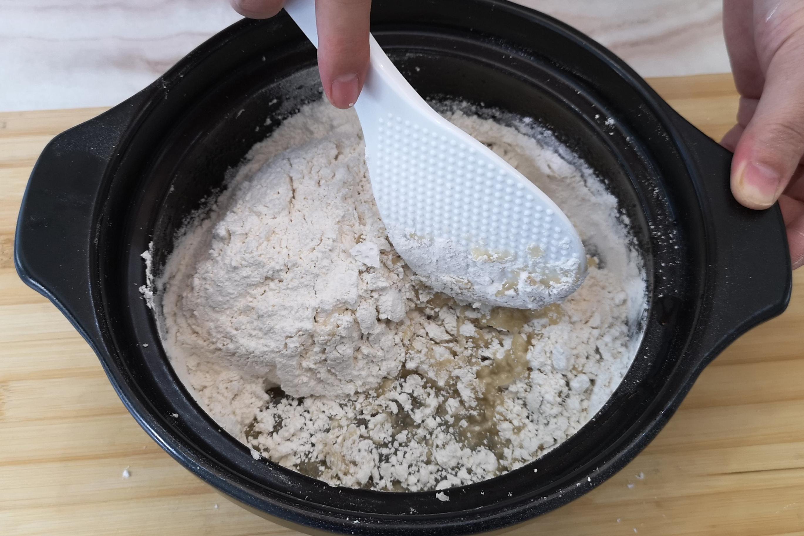 2. 篩入麪粉,用刮刀翻拌成團,然後用手輕輕揉勻(不要過度揉麪)。