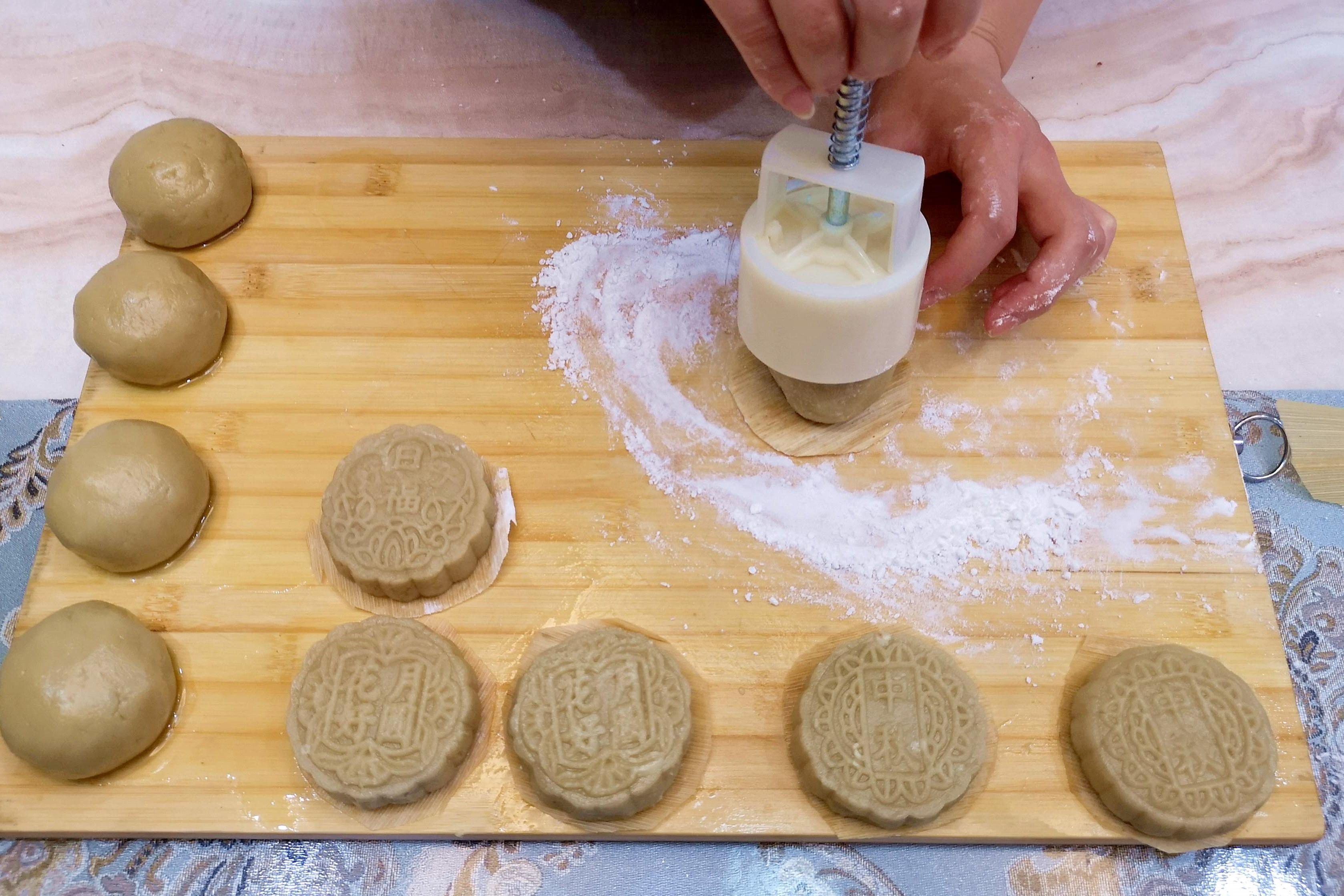 2. 包好的月餅球稍微搓成圓柱形,放入月餅模具中。