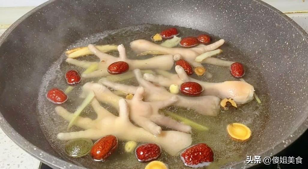 2、鍋裏放冷水,放入雞腳,加一勺料酒和幾片生薑,開火煮開。這一步是爲了去除雞腳的腥味,水開後煮兩三分鐘就行,不用太久。焯好水的雞腳撈出來,用溫水沖洗乾淨表面的浮沫,記得是溫水哦,用冷水的話雞腳遇冷收縮,口感會變硬。