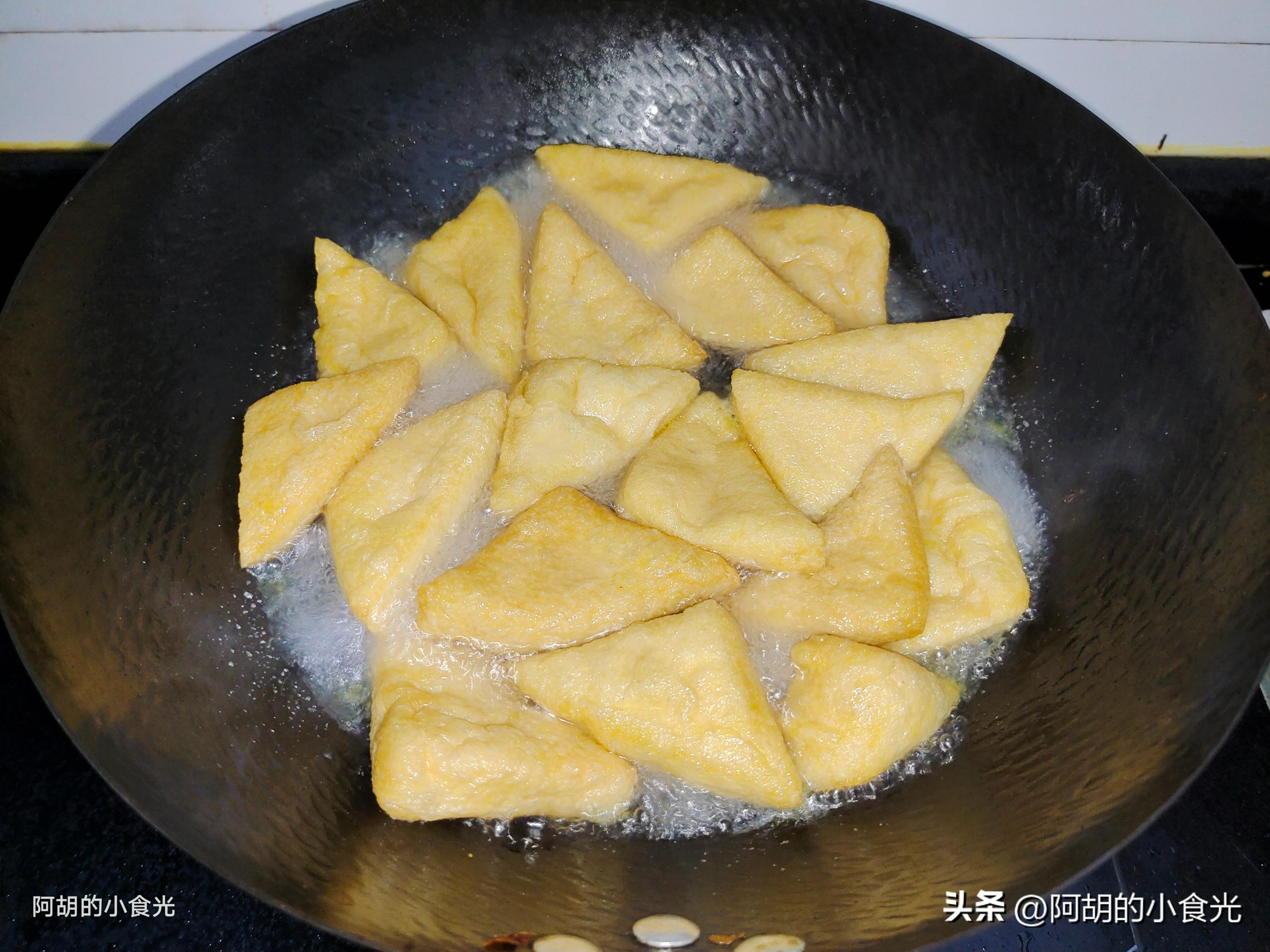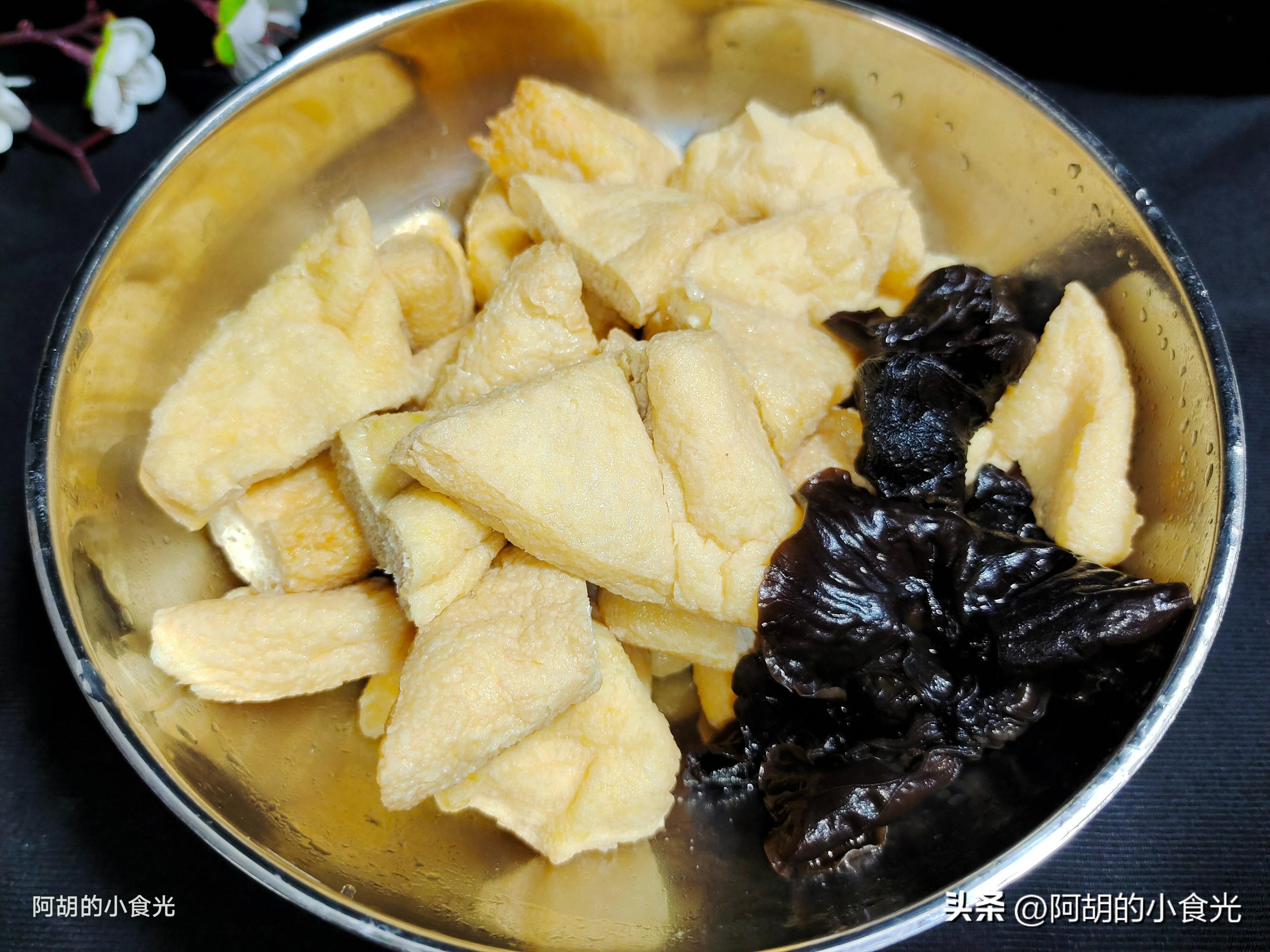 第一步:準備一些油豆腐,鍋裏燒一些開水,把油豆腐倒入開水鍋中焯燙兩分鐘,幫助去除一些油脂,撈出後用涼水衝一衝冷卻,再擠幹水分後用菜刀簡單切幾下備用。順便泡發一些幹木耳和豆腐放一塊備用。