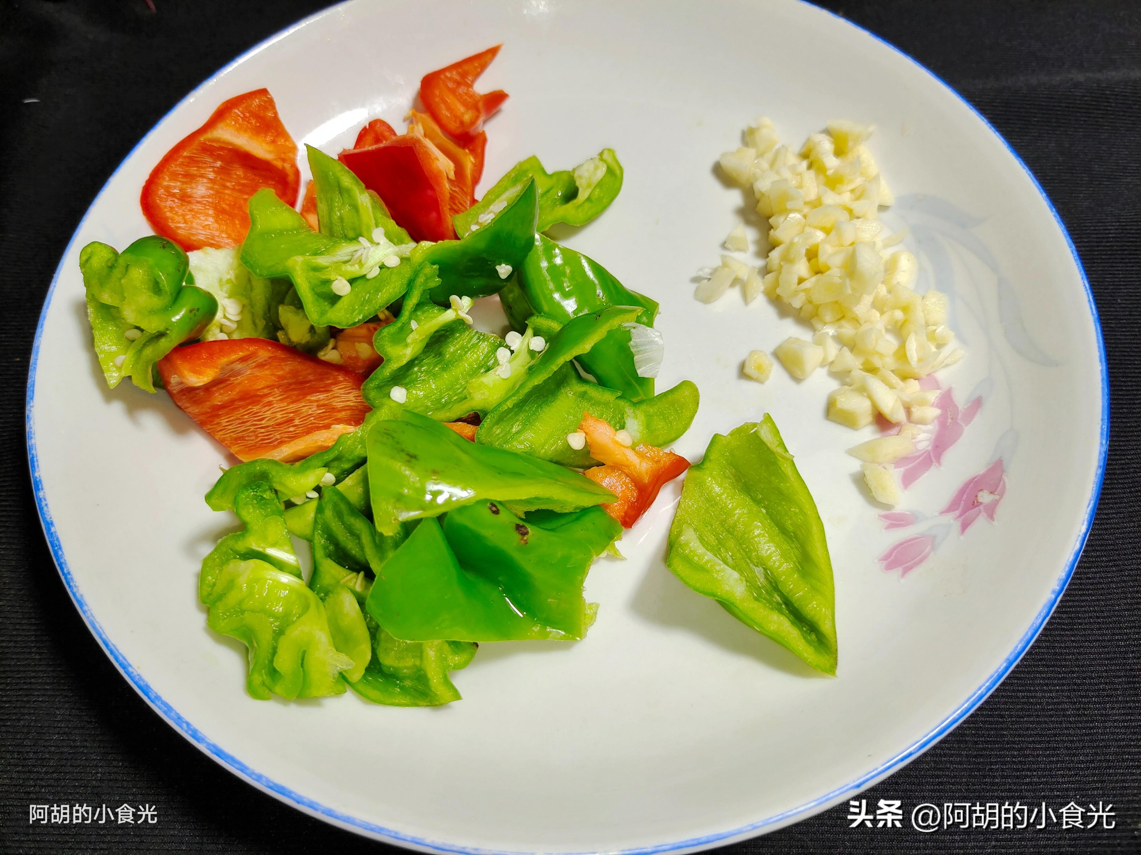 第三步:準備的輔料有青紅椒各一個洗淨去掉辣椒籽後切塊備用。還有一些蒜末用來作爲小料使用。如果喜歡辣味的此時可以添入一些幹辣椒節一塊。