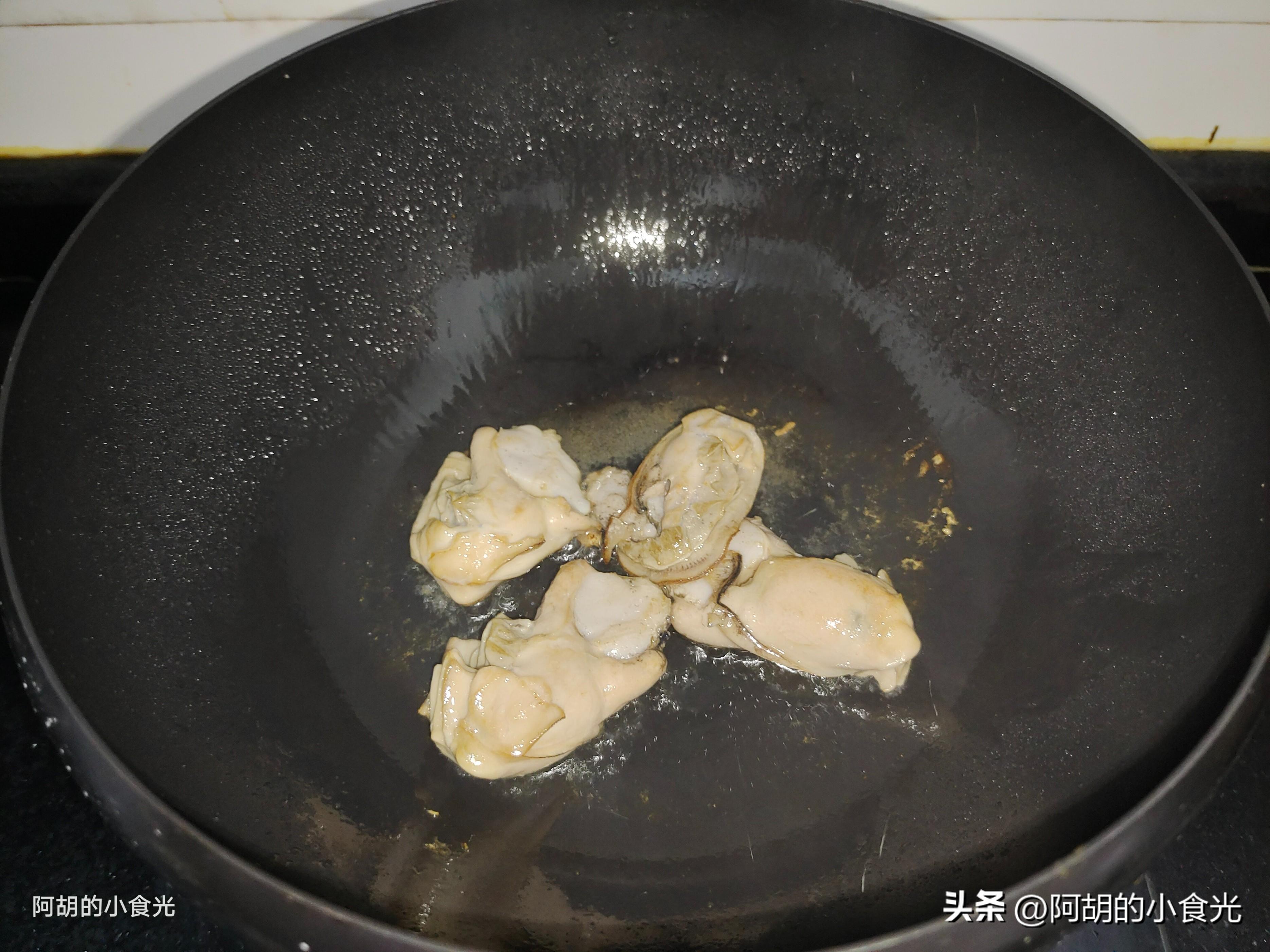 第二步:準備5個生蠔,取出蠔肉後清洗乾淨,同樣的下入開水鍋中簡單焯燙十幾秒鐘,撈出後用廚房紙巾包好擠一擠,幫助吸出一些水分。而後下入油鍋中煎一煎,淋入一些料酒去腥味,將其表面煎至微微金黃的時候就盛出置於一邊備用。