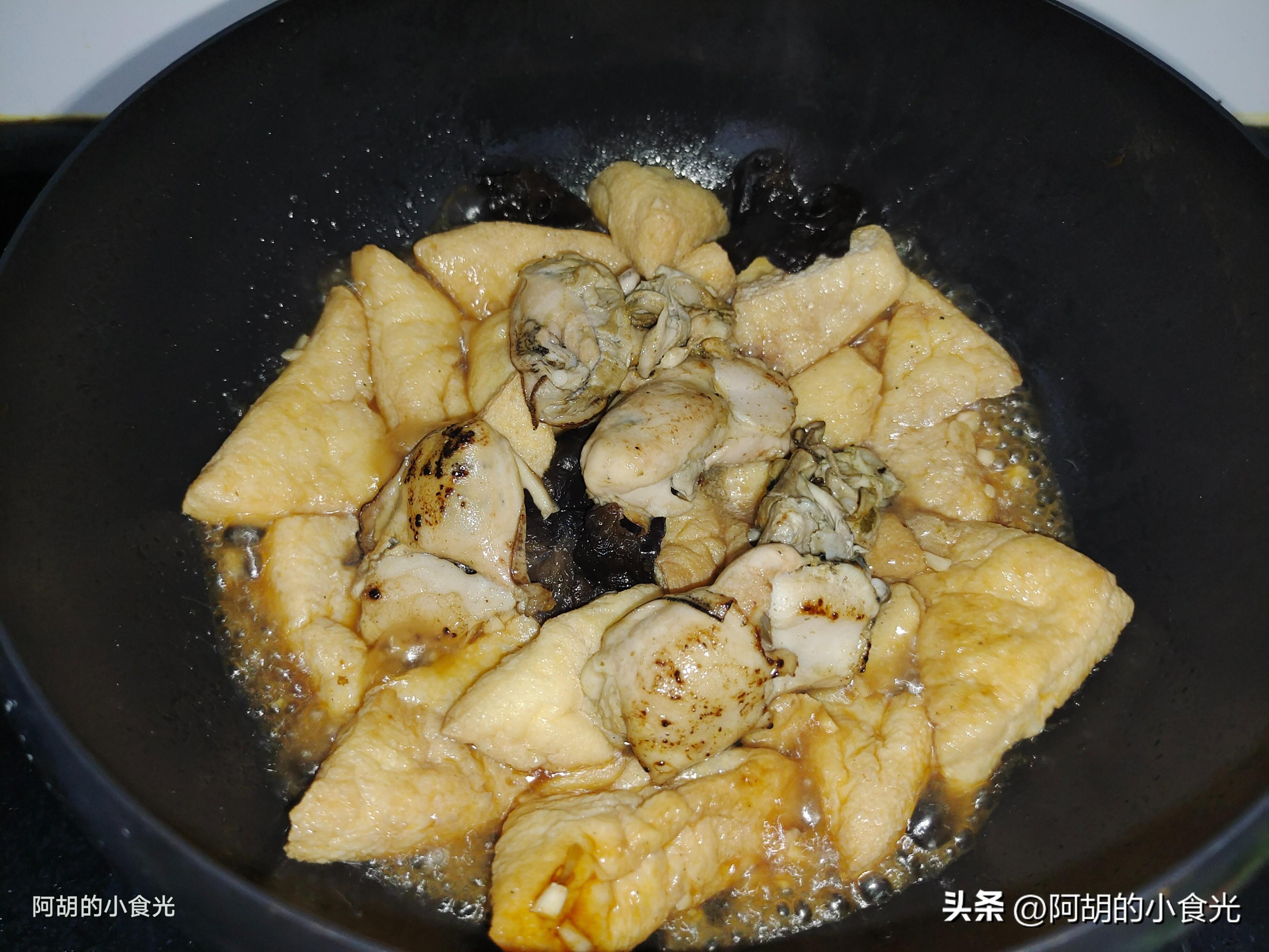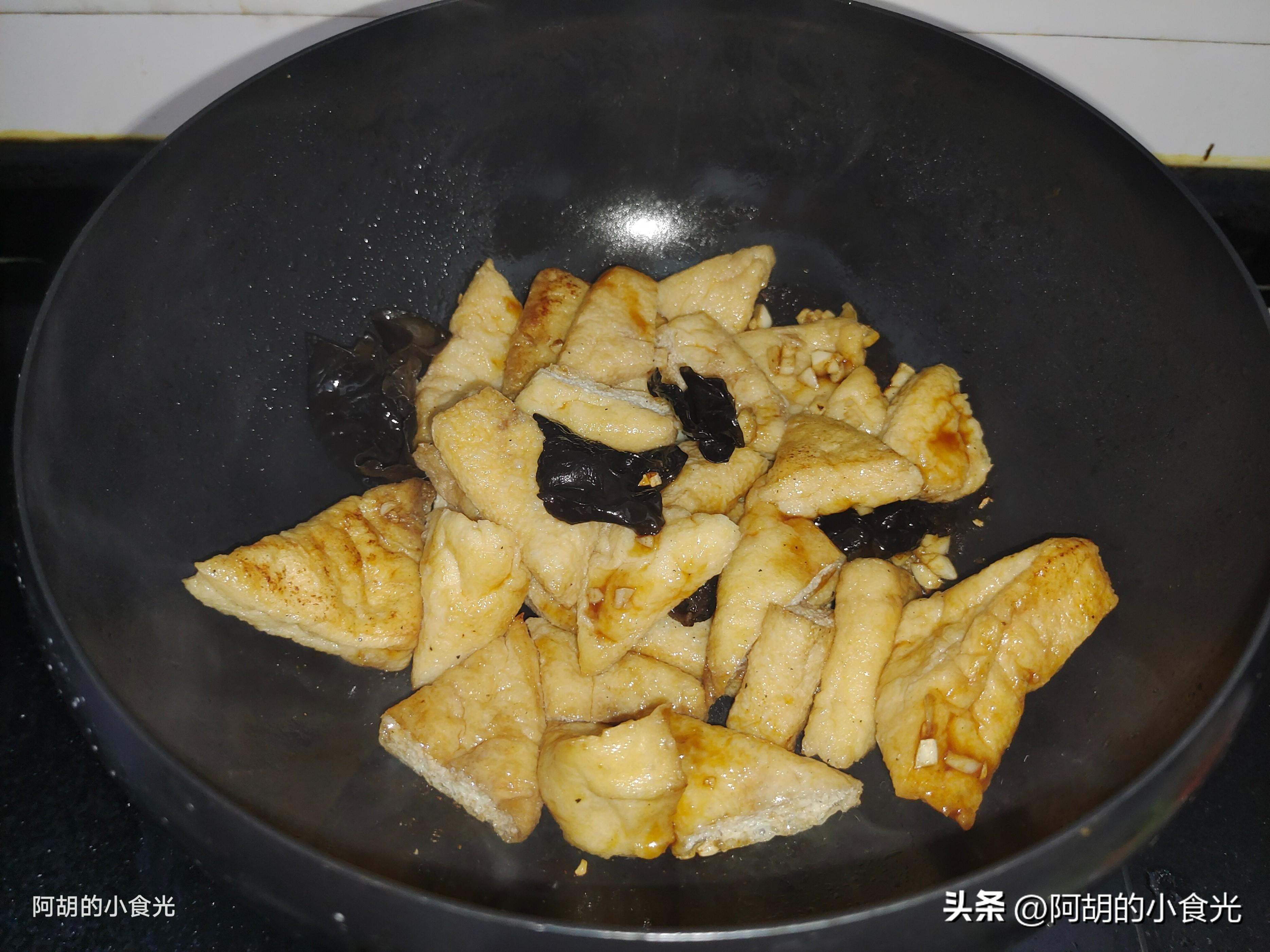 第四步:所有食材搭配好以後就可以開火烹飪了。就用煎蠔肉的油鍋,小火燒熱後淋入一些花生油後,把蒜末倒入鍋中炒出香味,接着轉爲大火把油豆腐和木耳一塊倒入鍋中炒一炒,淋入一些生抽和蠔油後再炒勻。