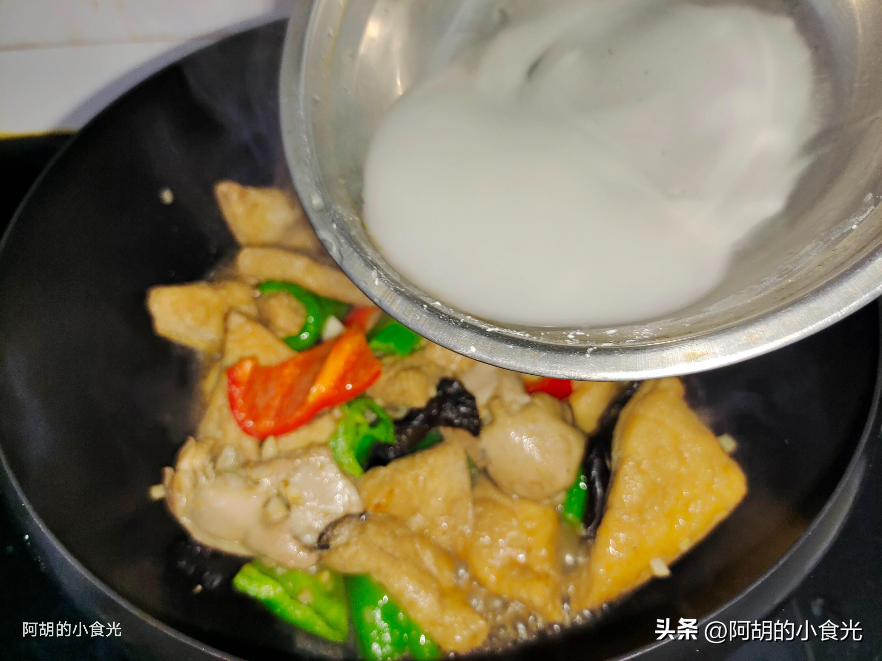 第六步:取出青紅椒塊倒入鍋中,保持大火炒一炒激發出椒香味。最後取出用涼水稀釋的澱粉水淋入鍋中,同時鍋內保持大火快速翻炒,讓剩下的湯汁濃稠起來後就可以出鍋裝盤了。很簡單的一道炒菜,有蠔肉的鮮,油豆腐的嫩而多汁,一口就開胃,妥妥的下飯好菜,感興趣的不妨試一試這個做法。