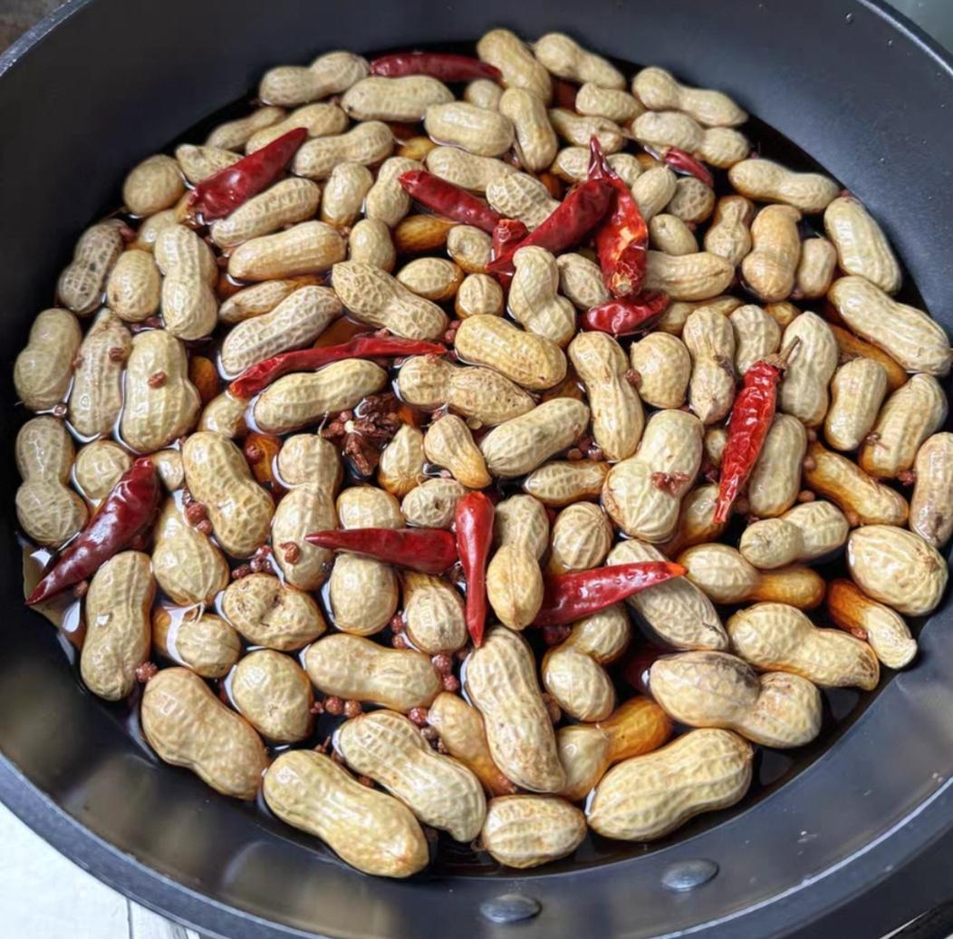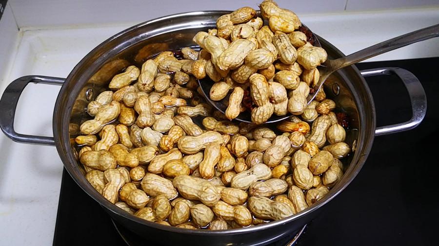 花生煮好後關火,但不要立馬撈出來,讓它繼續在料水裏浸泡上1~2個小時左右,讓其更加充分地吸足料汁入味。這樣煮好的花生不會發幹,還不會因爲長時間的煮制而變得發黑。