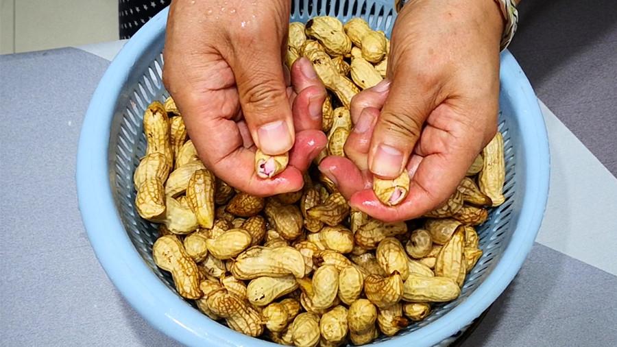 2.接着,將每個花生的頂端都輕輕捏一下,捏開個小口——這一步是花生入味的關鍵!小口能讓調料水充分滲透到花生仁裏面,從而避免了“外鹹裏淡”的情況;而且還能縮短煮制的時間,讓花生仁更快變軟糯。