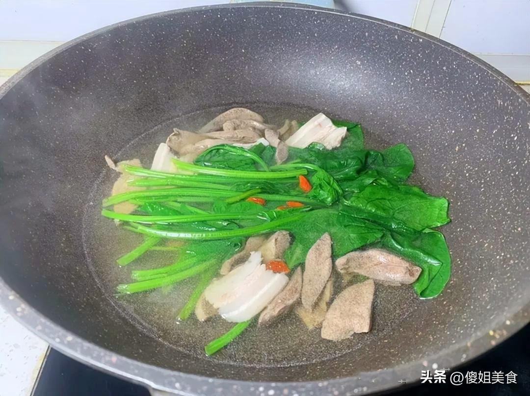 菠菜下鍋後燙一下就好,千萬別煮太久,否則顏色會變黃,口感也會變差。最後撒上一把枸杞,加點鹽和雞精調味,再滴幾滴香油,一鍋香噴噴的豬肝菠菜湯就做好了。