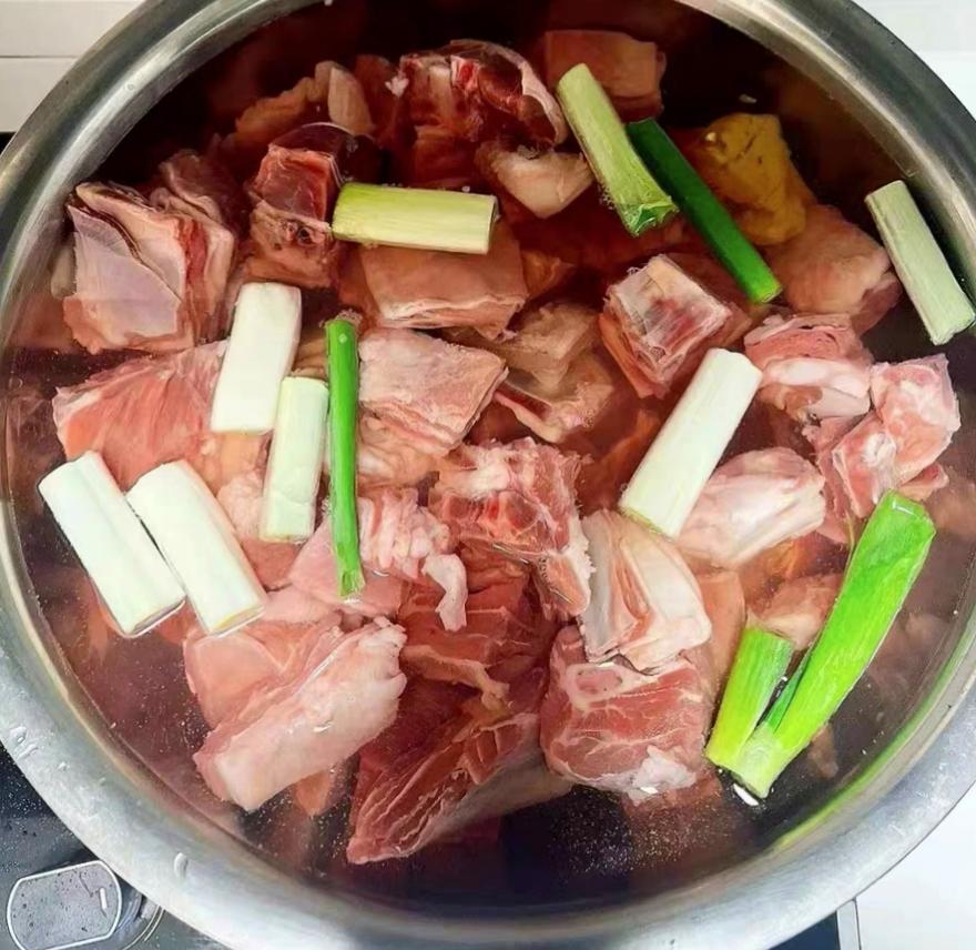 • 泡好的羊肉冷水下入鍋中,加入適量薑片、蔥段和料酒,大火煮開後,用勺子撇去浮在表面的浮沫(血水和雜質),煮大約3~5分鐘後,撈出羊肉,用溫水沖洗乾淨後備用(別用冷水洗,冷水洗羊肉遇冷會收縮,煮好後羊肉會發柴。