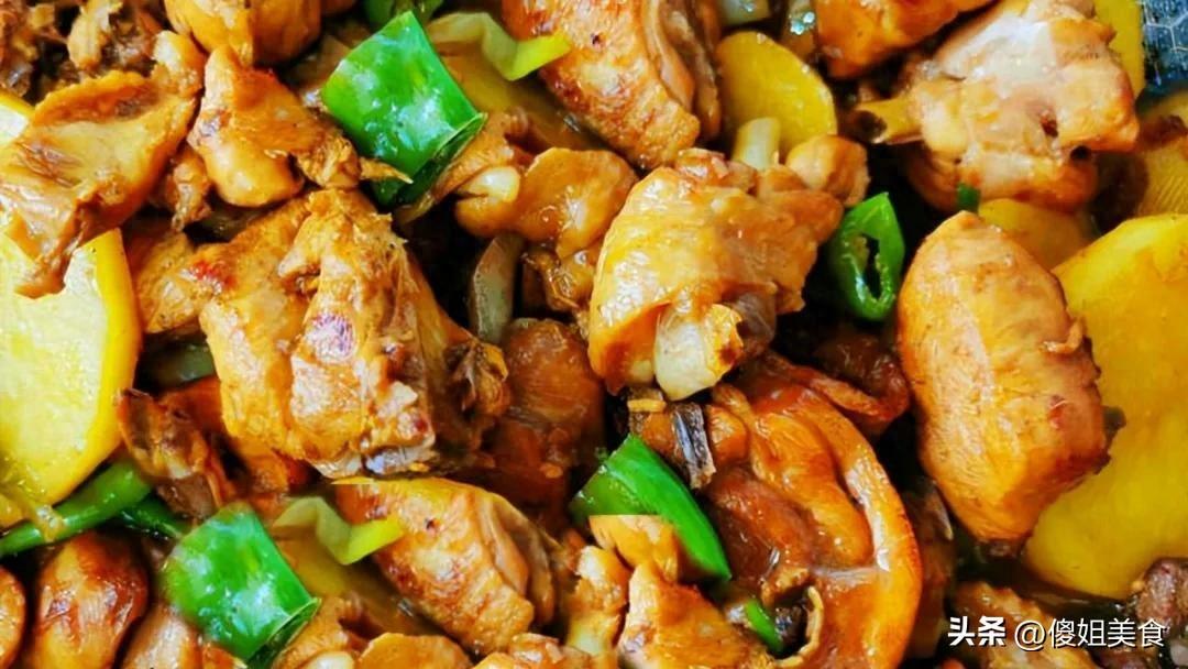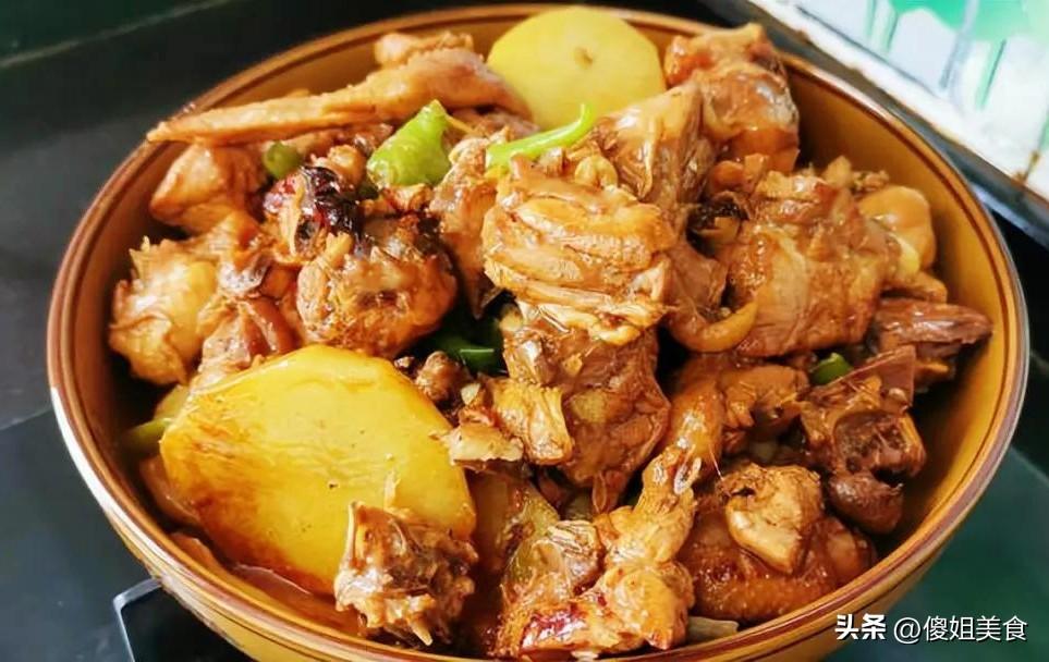 【家常燉雞】所需食材:白條雞1只(約2斤)、土豆2個、桂皮1小段、八角2顆、香葉2片、小蔥3根、大蒜5瓣、生薑1塊、蠔油2勺、老抽1勺、生抽3勺、鹽適量、食用油適量、幹辣椒3個(不喫辣可省略)、線椒1個(裝飾用)、白糖1小勺、料酒2勺