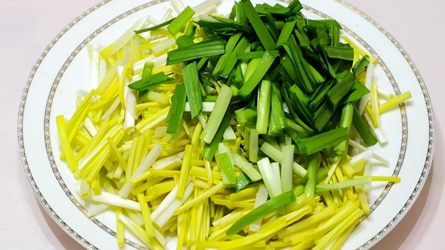 再準備一把韭菜,洗淨去根後,切成和韭黃差不多長的段(韭菜可以起到搭配顏色的作用,看起來更有食慾);