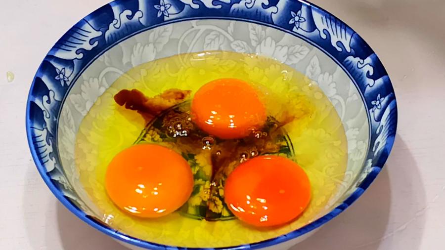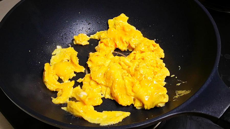 燒至油溫6成熱時,將打散的蛋液倒入,保持中火煎炒,煎至蛋液底部凝固,表面的蛋液還微微流動的時候,用鏟子快速地將其炒成大小均勻的塊,炒至蛋液完全凝固,而且邊緣略帶金黃時,關火盛出備用。此時的蛋最鮮嫩,不要炒久了,炒久了,雞蛋會變老變柴。