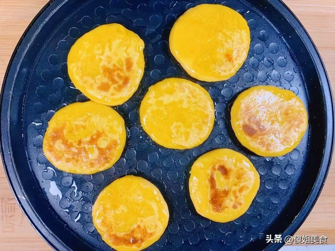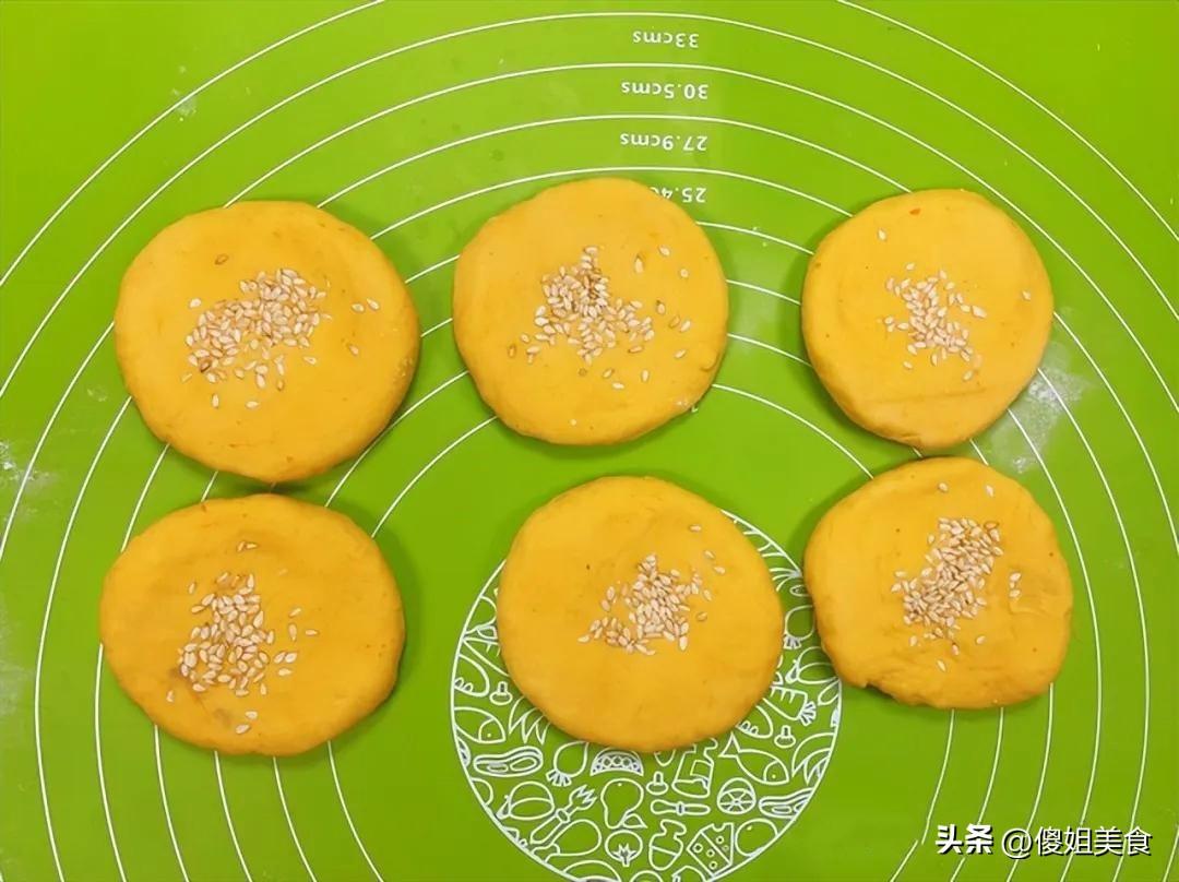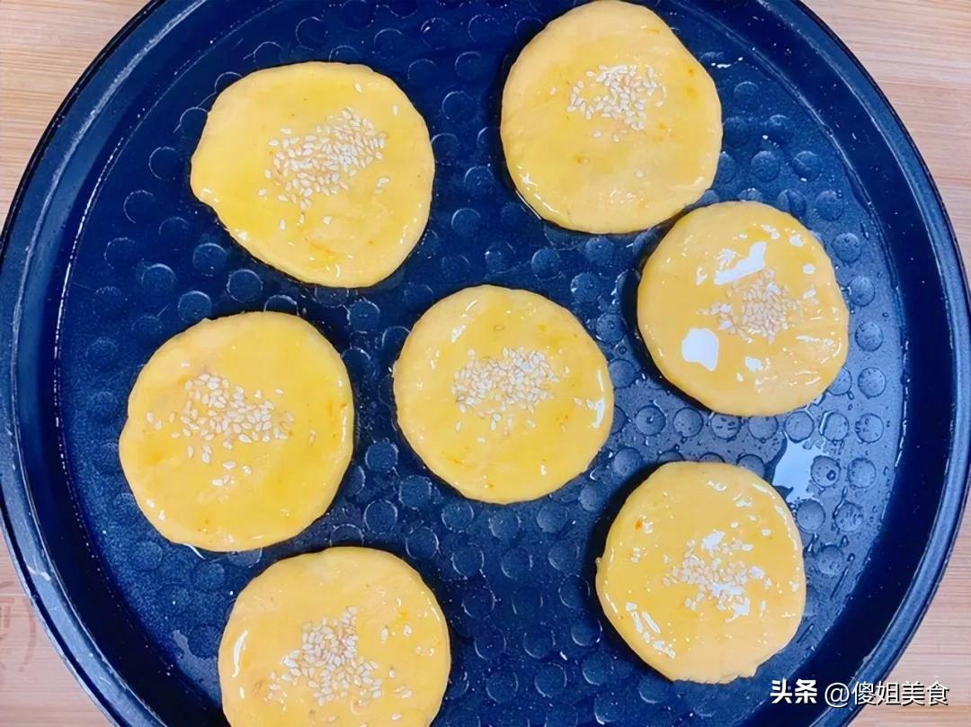 半個小時後,將麪糰分成幾個小劑子,逐個按成圓餅狀,然後在表面撒上白芝麻。電餅鐺預熱後刷上一層薄薄的食用油,小餅整齊地擺進去,不過幾分鐘,一面就烙成了金黃色。翻面再烙一會兒,待兩面都金黃誘人時,柿子小餅就做好了。婆婆剷出一個遞給我:“小心燙,慢慢喫。”