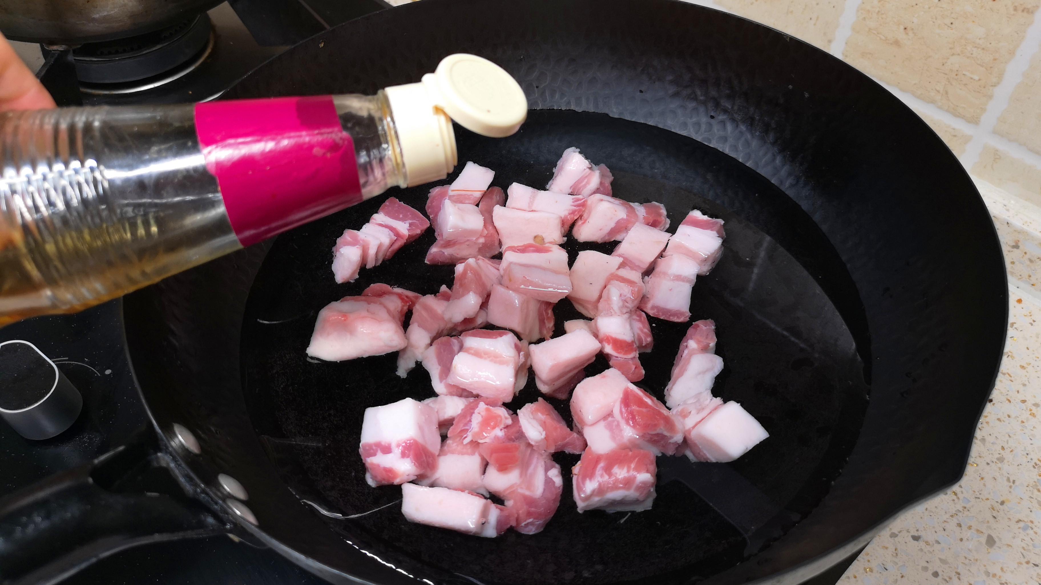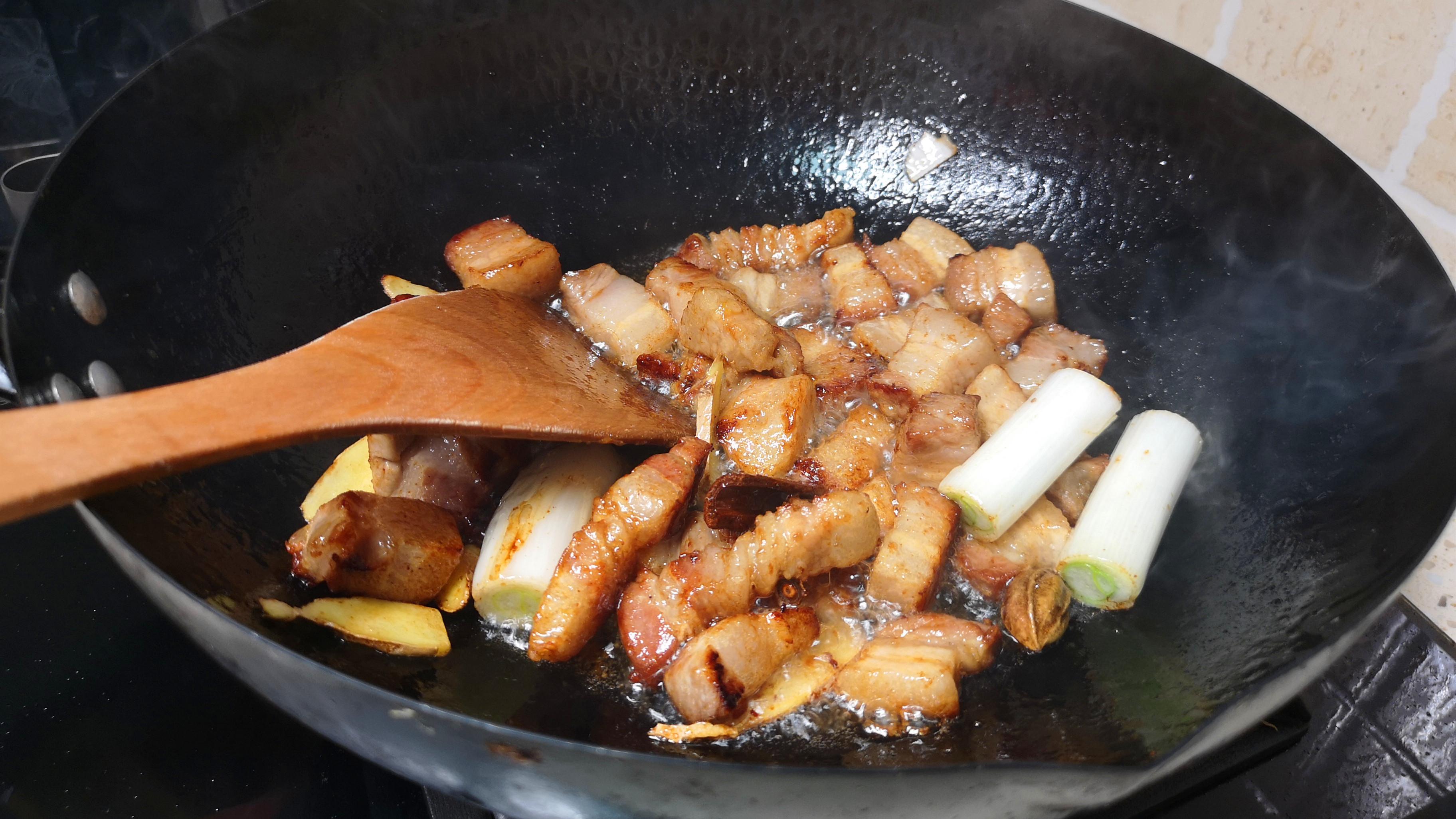 3. 炒糖色(關鍵步驟!):鍋裏放少許油,放入冰糖,開小火慢慢熬。看到冰糖融化,變成棗紅色,並冒起小泡泡時,迅速倒入焯好水的五花肉塊,快速翻炒,讓每塊肉都均勻地裹上糖色。這樣燉出來的肉顏色紅亮,特別有食慾。
