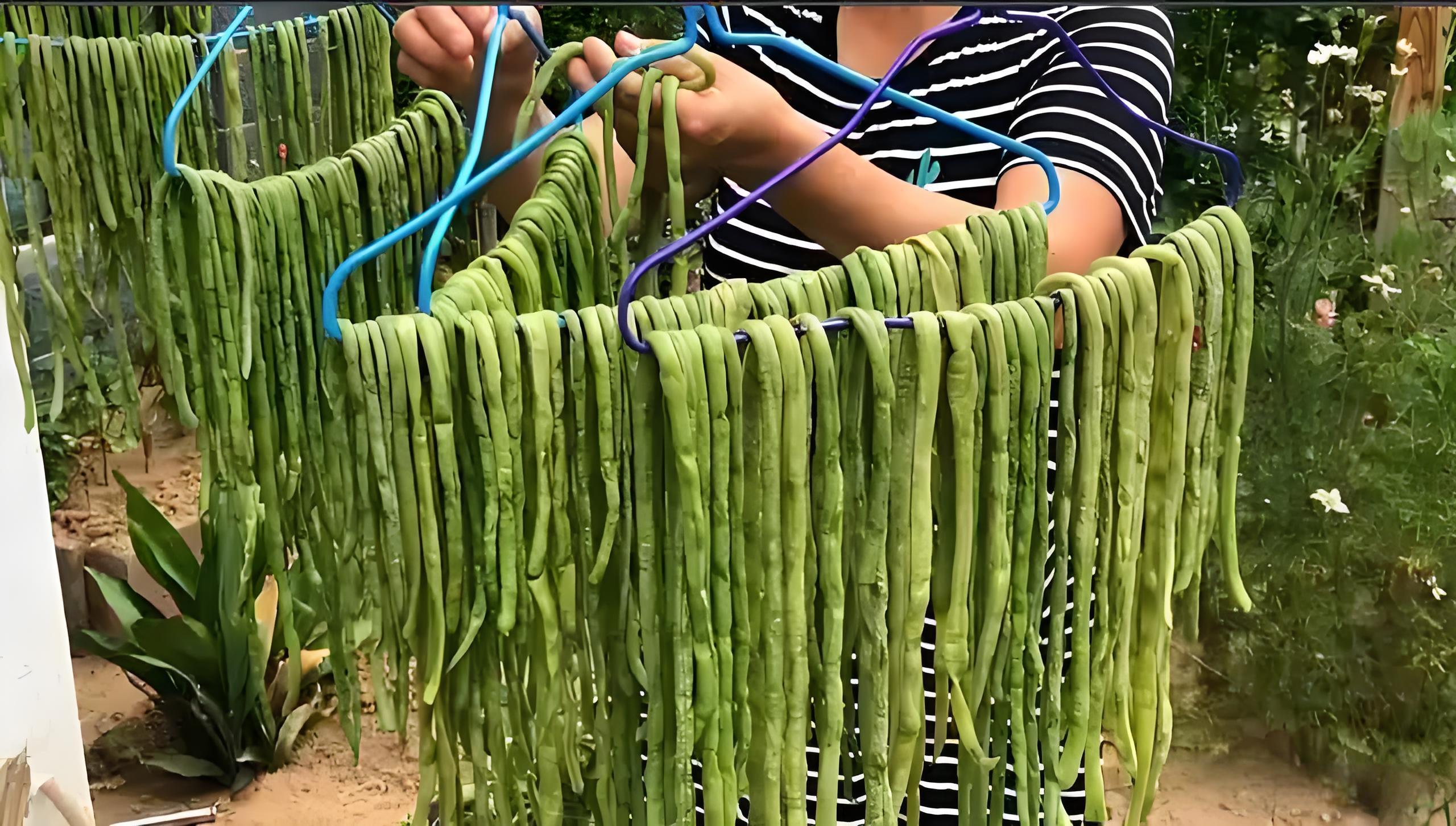 * 把焯好的豆角,一根一根地掛在衣架上或者晾衣繩上,放在太陽底下暴曬。一般曬個三四天,摸起來乾乾硬硬的,一掰就斷,就成了。收起來裝在塑料袋裏,紮緊口,放在陰涼乾燥處就行。