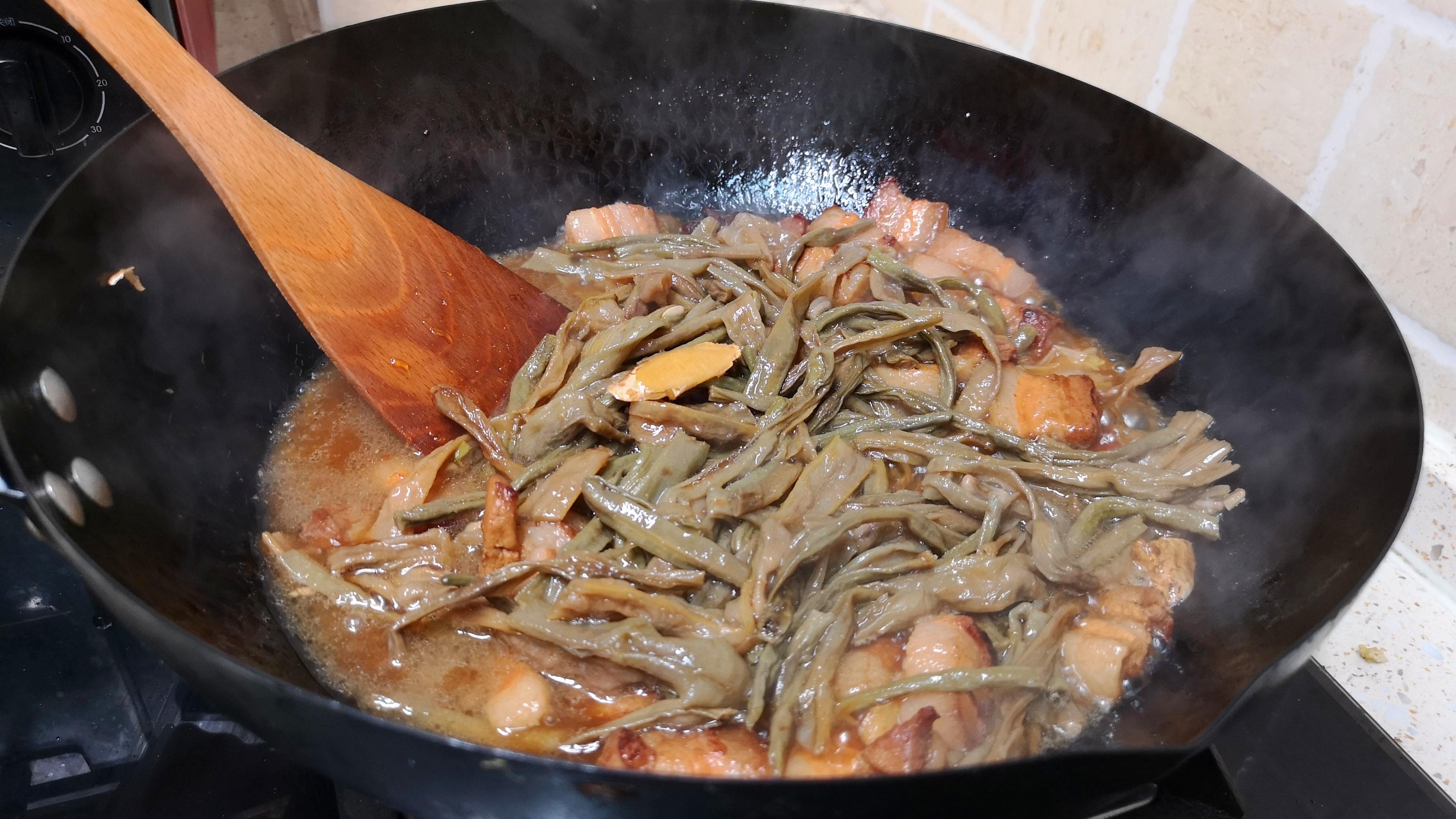 5. 加入幹豆角:40分鐘後,打開鍋蓋,放入泡發好的幹豆角,翻拌一下,讓幹豆角浸在湯汁裏。根據口味加適量的鹽調味。繼續蓋上蓋子,小火再燉20-30分鐘。直到五花肉軟爛入味,幹豆角吸飽了肉汁,變得油亮軟糯。最後開大火,把湯汁收濃一些,即可出鍋。