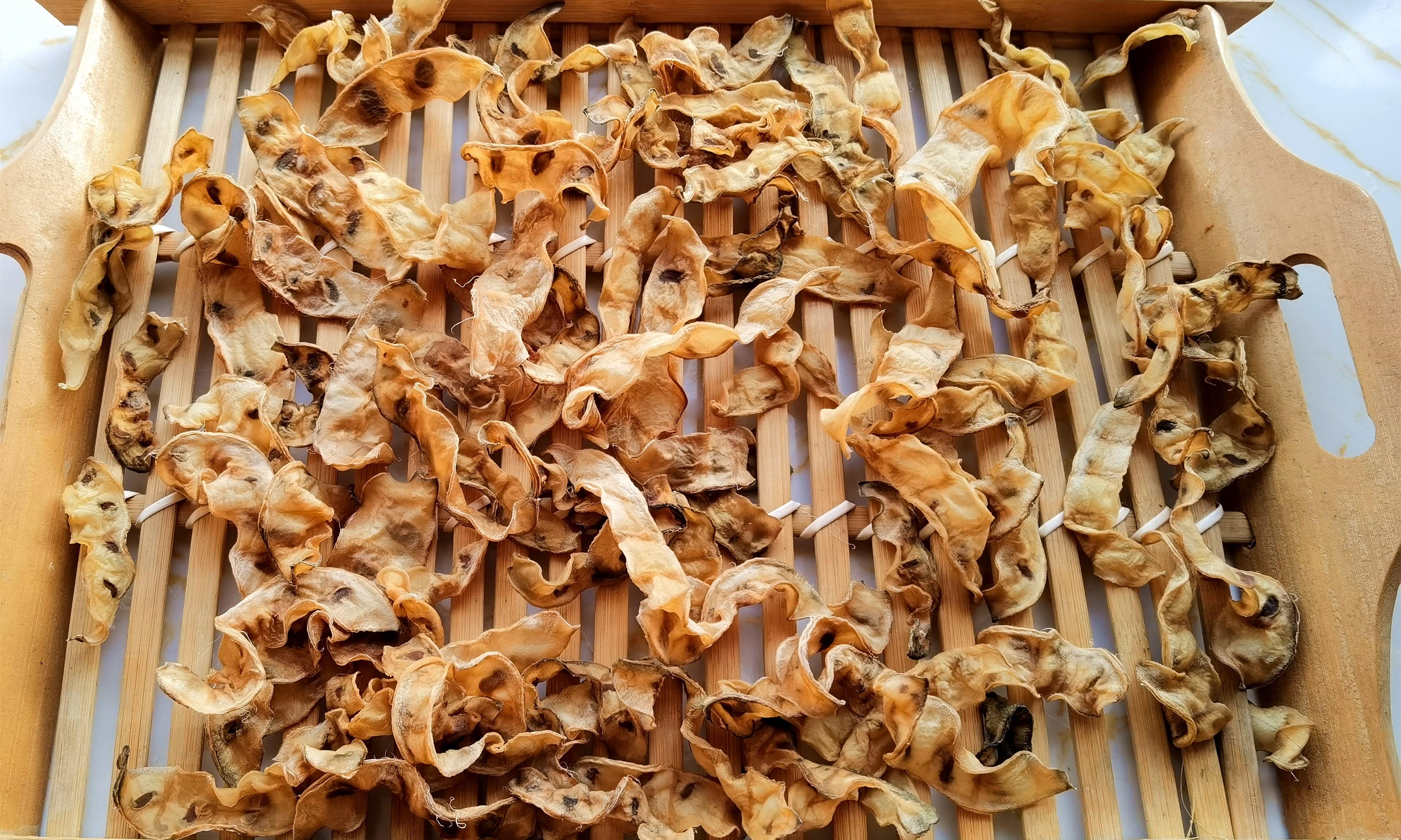 * 撈出過涼,然後可以整個曬,也可以像豆角一樣掛起來曬。曬到扁豆捲曲,顏色變深,硬邦邦的就可以了。