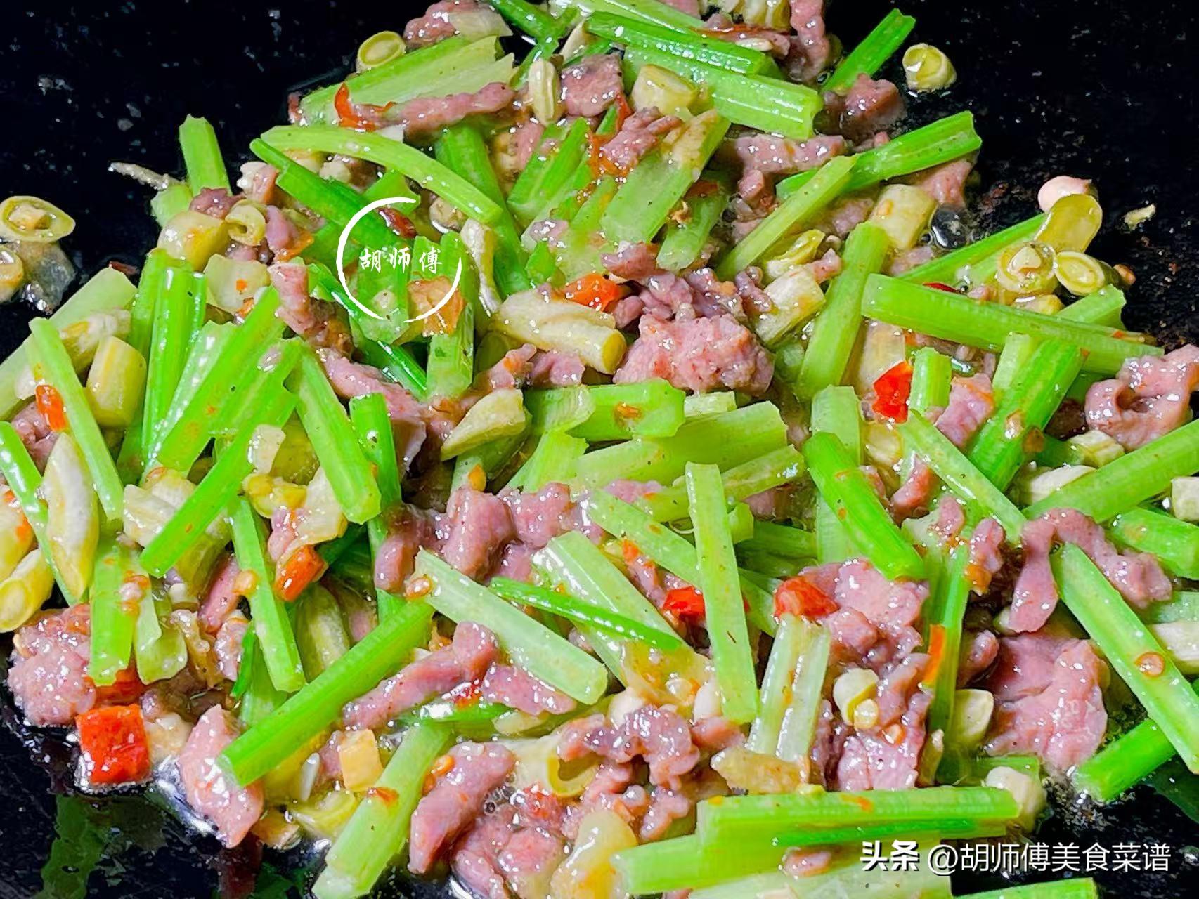 【食材準備】:芹菜100克、牛肉150克、小蘇打2克、澱粉、蠔油、食鹽、胡椒粉、蒜末、薑末適量、酸豆角末50克、剁椒醬(可不要)。