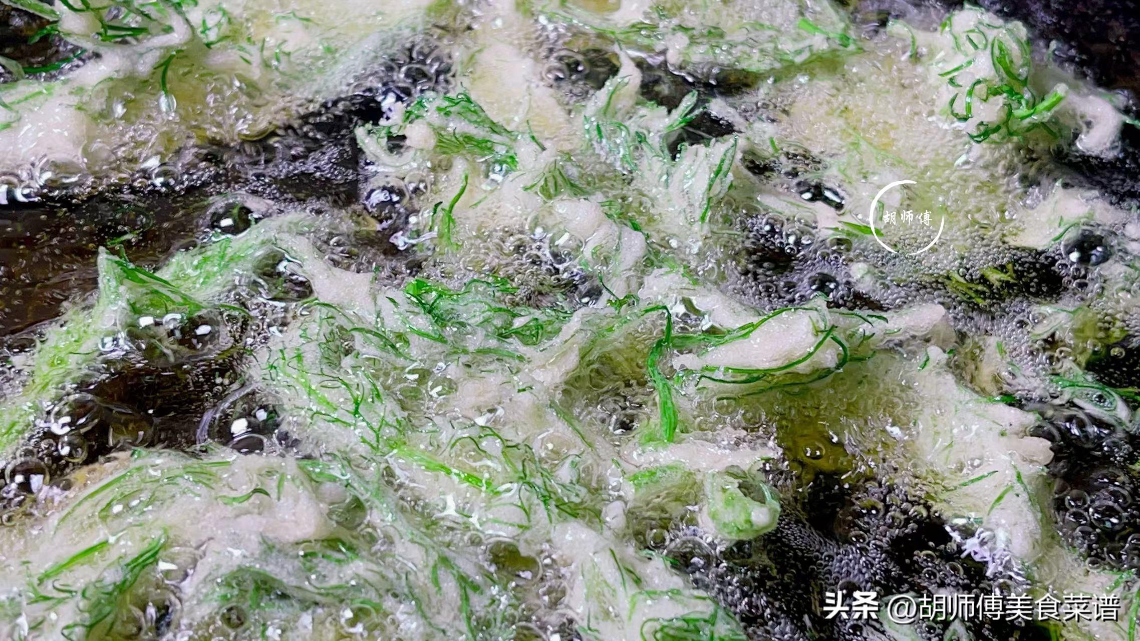 第三步:鍋中放入適量油,等油溫燒到7成熱後,將茴香菜放入鍋中,大火將茴香菜炸2分鐘後撈出,最後撒上一點椒鹽即可食用。
