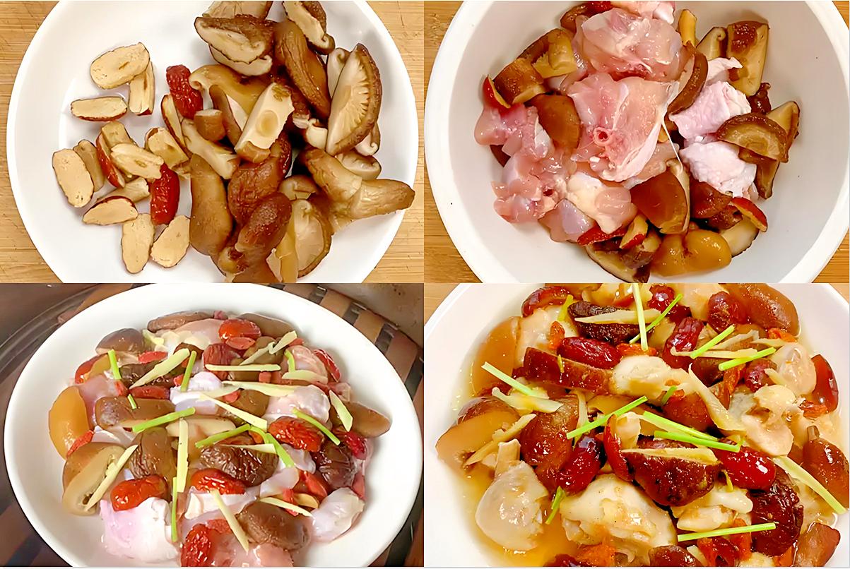 【食材準備】:雞大腿2個、幹香菇幾朵、紅棗5顆、生薑、生抽、蠔油、料酒、澱粉。
