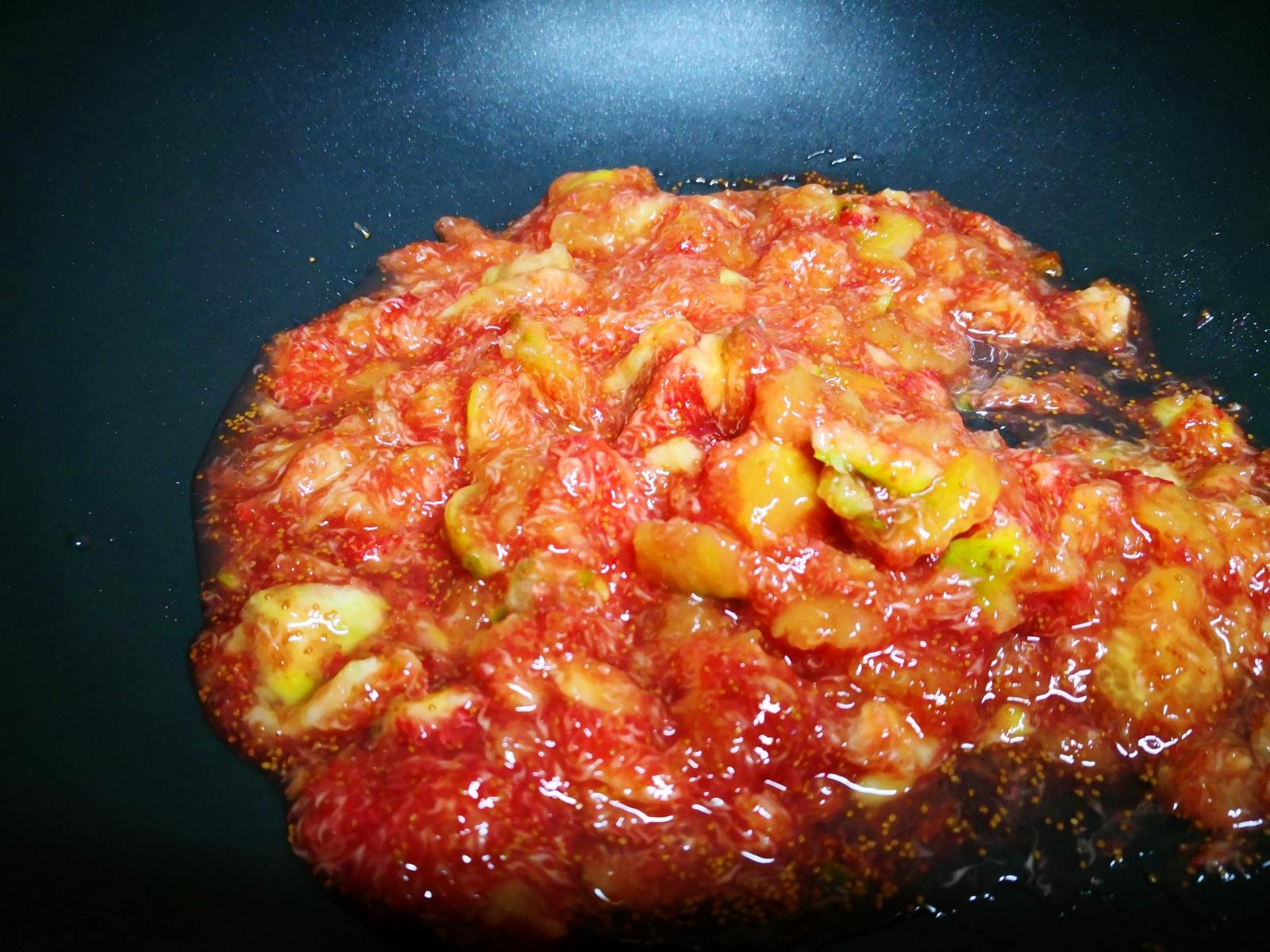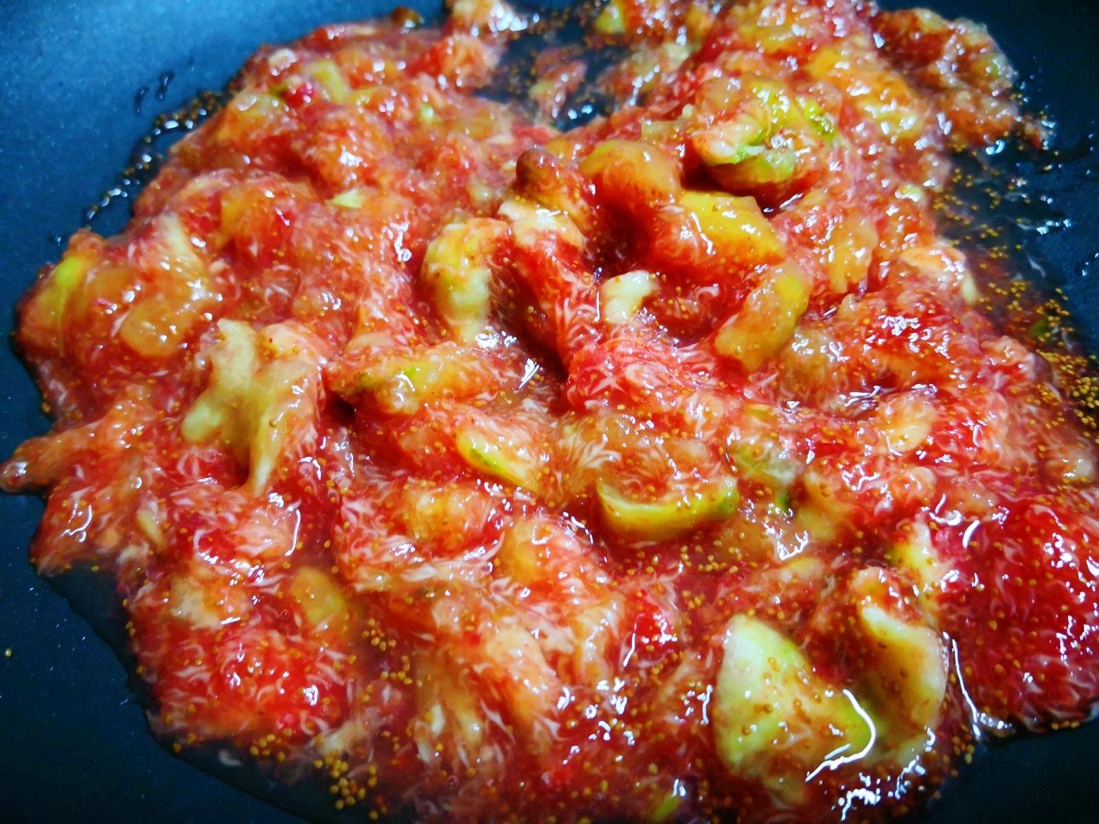 然後將無花果切成小塊,倒入鍋中,根據自己的口味放入冰糖或白糖,開小火慢慢熬製。