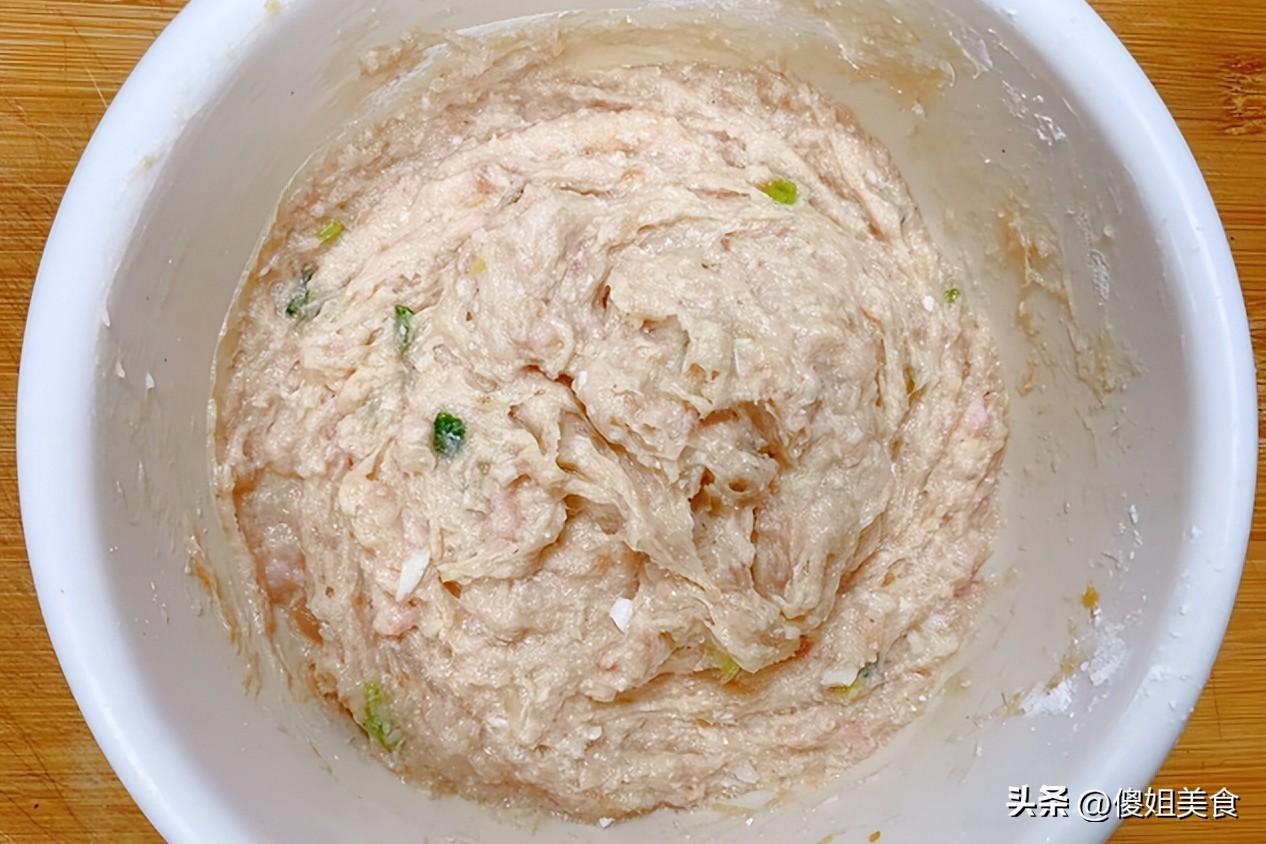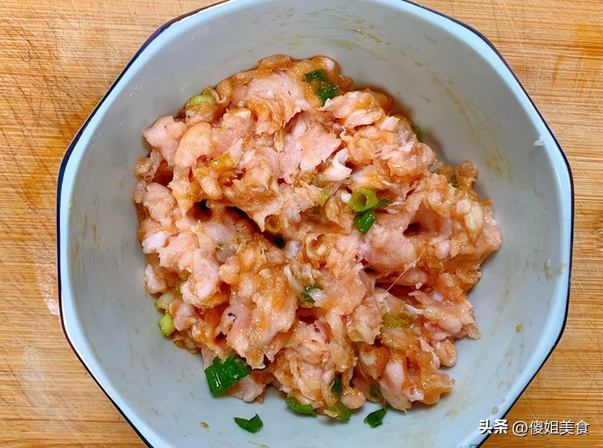 2、接下來準備肉餡,選用豬瘦肉,帶一點點肥的會更香,剁肉餡的時候,記得加入蔥薑末,這樣能去腥增香。把剁好的肉餡放在大碗裏,加入料酒、鹽、醬油,順着一個方向攪拌均勻,然後醃上一會兒,讓肉餡充分入味。