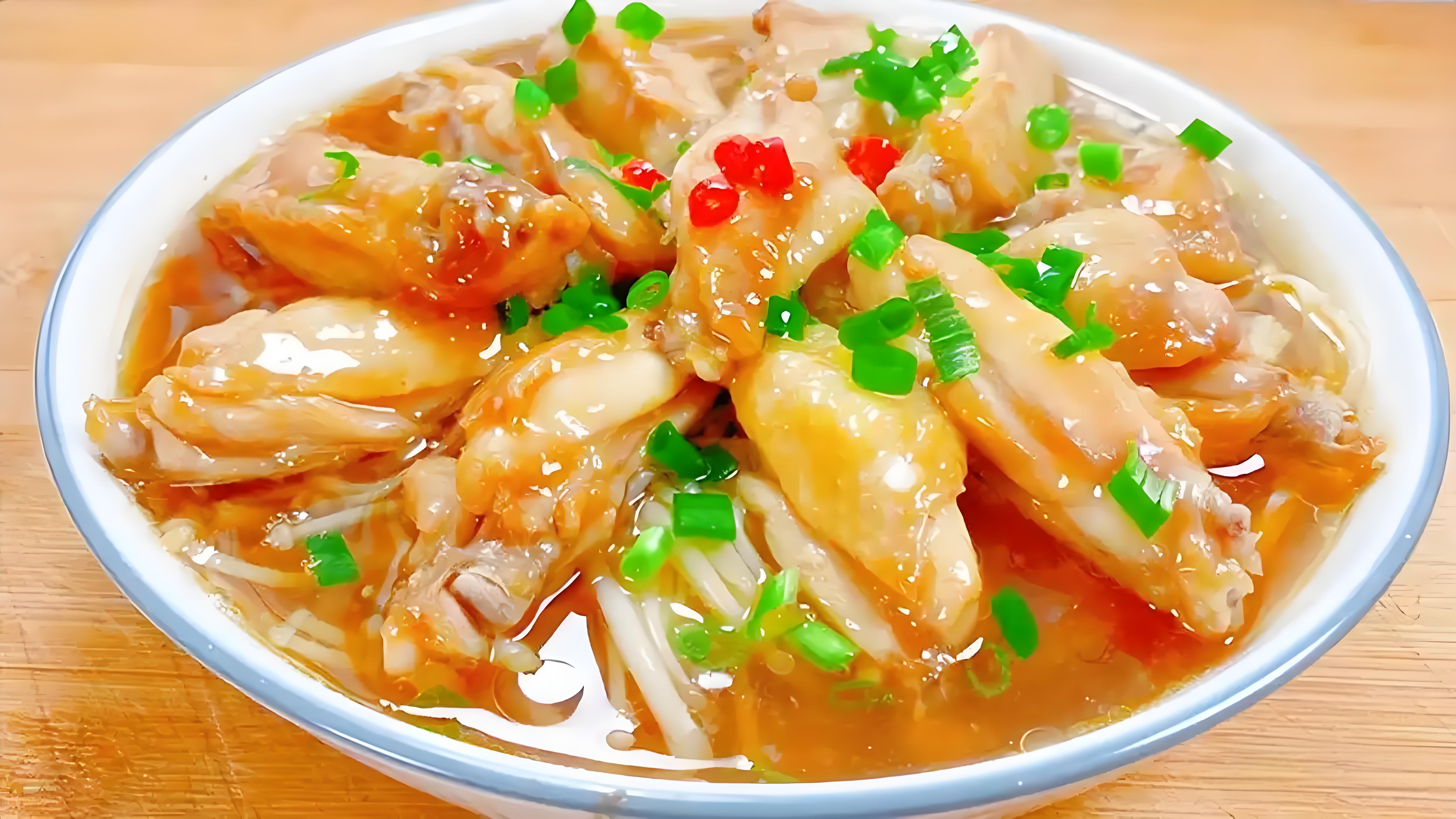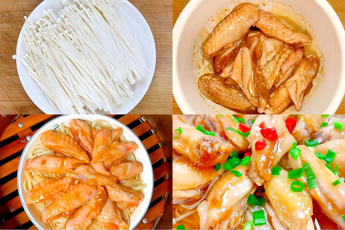 小貼士:金針菇富含多糖和氨基酸,能增強免疫力;雞翅蒸着喫不上火,鮮嫩入味。這道菜低脂又營養,老少皆宜!