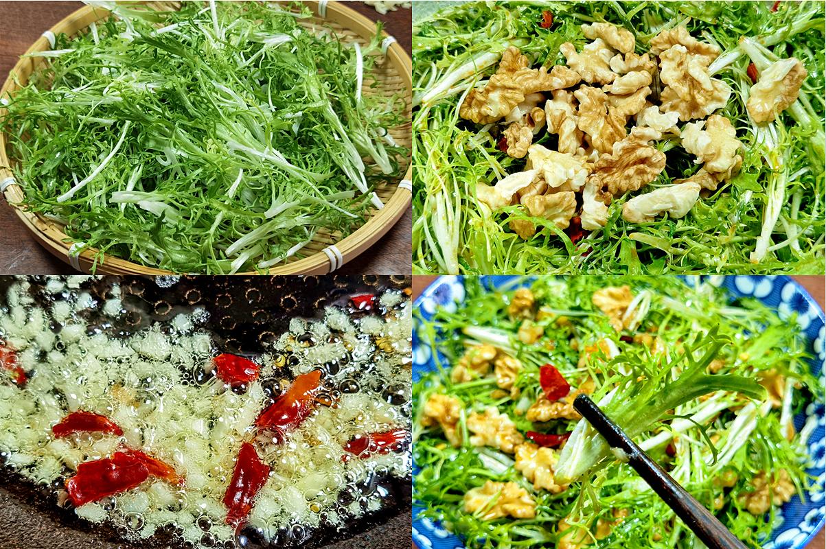 這道涼拌菜在我家秋季餐桌上出鏡率超高!苦菊微微的苦味正好能清熱降火,搭配核桃仁的香酥,口感豐富極了。最後那勺熱辣椒油簡直是點睛之筆,把所有的香味都激發出來了。秋天人容易煩躁,喫點苦菊能靜心安神,核桃又能補腦,一舉兩得!