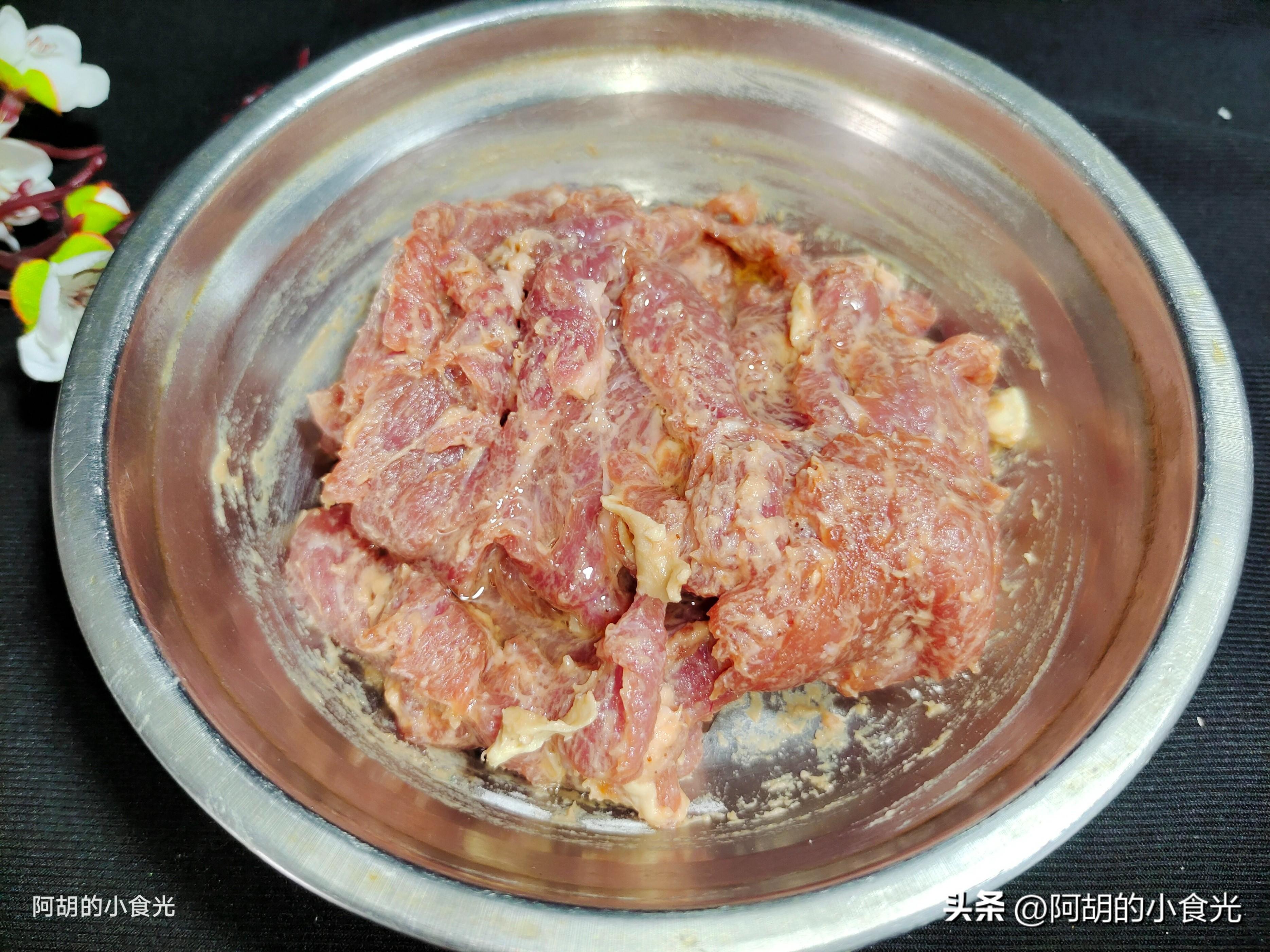 第三步:再來準備肉片部分,最好選用梅頭肉部位的瘦肉,切片後放入碗中,淋入一些生抽、蠔油、少許雞精和紅薯澱粉,再來兩塊關鍵的白腐乳,戴好一次性手套下手充分地抓勻,最後再來一些花生油拌勻置於一邊等待使用。此處用紅腐乳製作也可以。