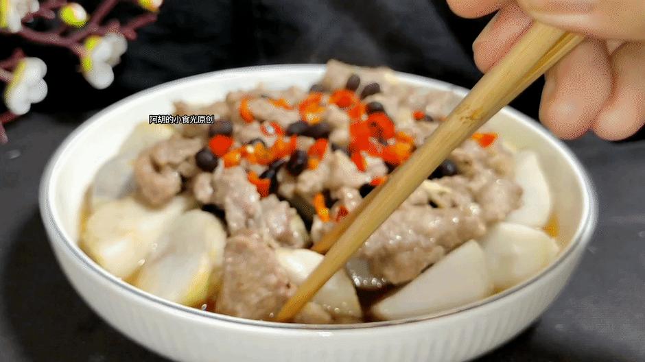 第五步:鍋裏添入涼水,把蒸盤上鍋加蓋開大火蒸,觀察鍋蓋內完全上汽後就開始計時,差不多十分鐘的時間就夠了。開蓋後可以點綴一些蔥花就可以上鍋開喫了。這個肉片鮮香軟嫩,芋艿滑嫩爽口,兩相搭配着實很開胃,這個季節就適合喫這種菜,感興趣的一定要試一試這個做法。