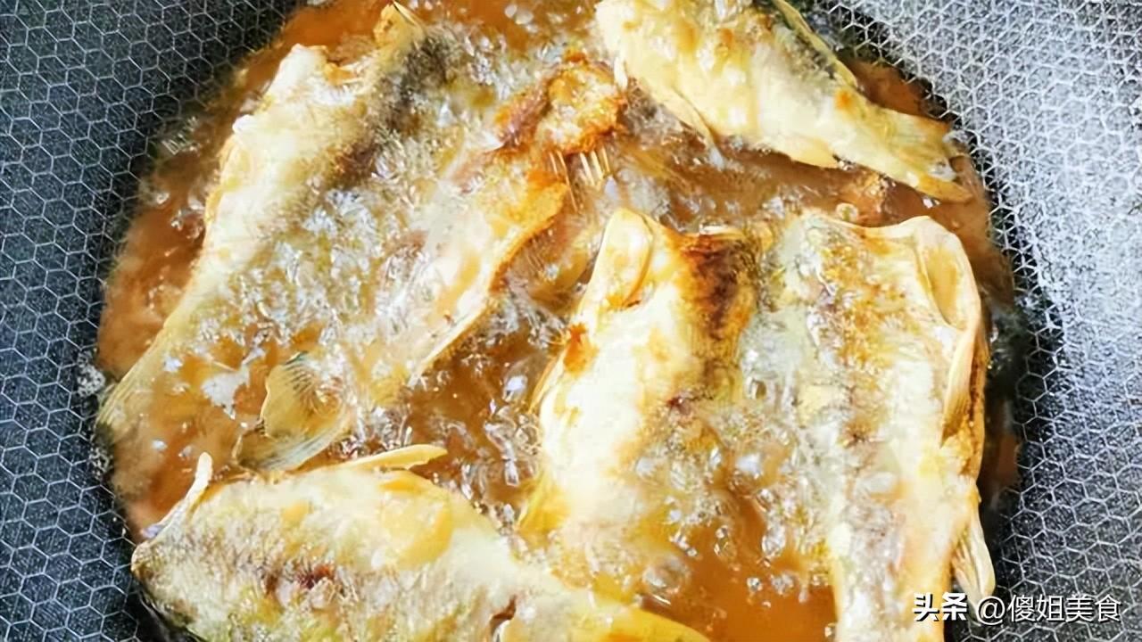 煎魚是關鍵一步,鯽魚要先用廚房紙吸乾水分,然後薄薄地拍上一層面粉。鍋燒熱後倒入花生油,油溫升高後把鯽魚放進去,煎到兩面金黃,這時候魚皮完整,不容易破,燉出來的魚肉也更入味。