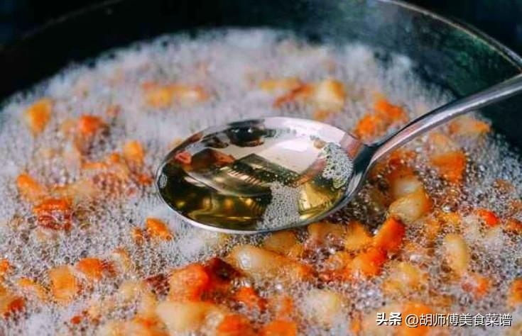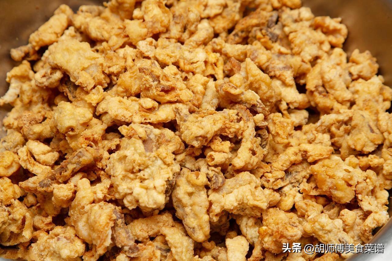 【胡師傅有話說】:炸豬油渣時,一定要加適量水炸,因爲水不僅可以將豬板油中的腥味帶走,而且還能使豬板油出更多的油。再炸豬油渣時,一定要時不時的將豬板油攪拌一下,防止豬板油受熱不均,導致豬板油發糊。