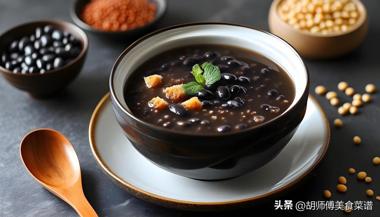 【製作方法】:首先將黑豆、黑芝麻、黑米、紅豆全都沖洗乾淨,然後把它們和適量冷水放入鍋中,大火將水煮沸後改小火,繼續煮25分鐘,等粥比較黏稠時,就把冰糖放入鍋中,繼續攪拌5分鐘左右,等冰糖完全融化後即可食用。