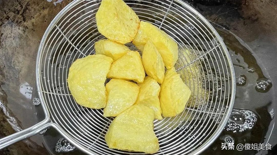 第四步:鍋裏倒油,比平時炒菜多一些,油熱後把土豆塊倒進去,中小火慢慢煎炸。耐心點,別老是翻動,讓每一面都煎到金黃酥脆。看到表面形成一層金黃色的殼就可以了,這時候的土豆已經香到讓人忍不住想偷喫了,裝盤盛出。