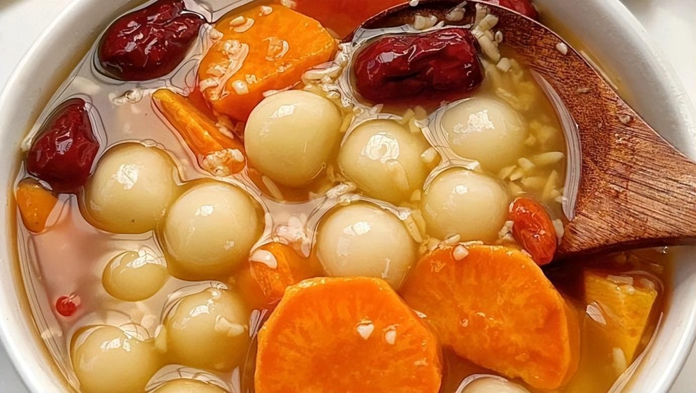 4起鍋前,加入枸杞,紅糖融化即可。做好的美食紅薯軟綿,小圓子 Q 彈。