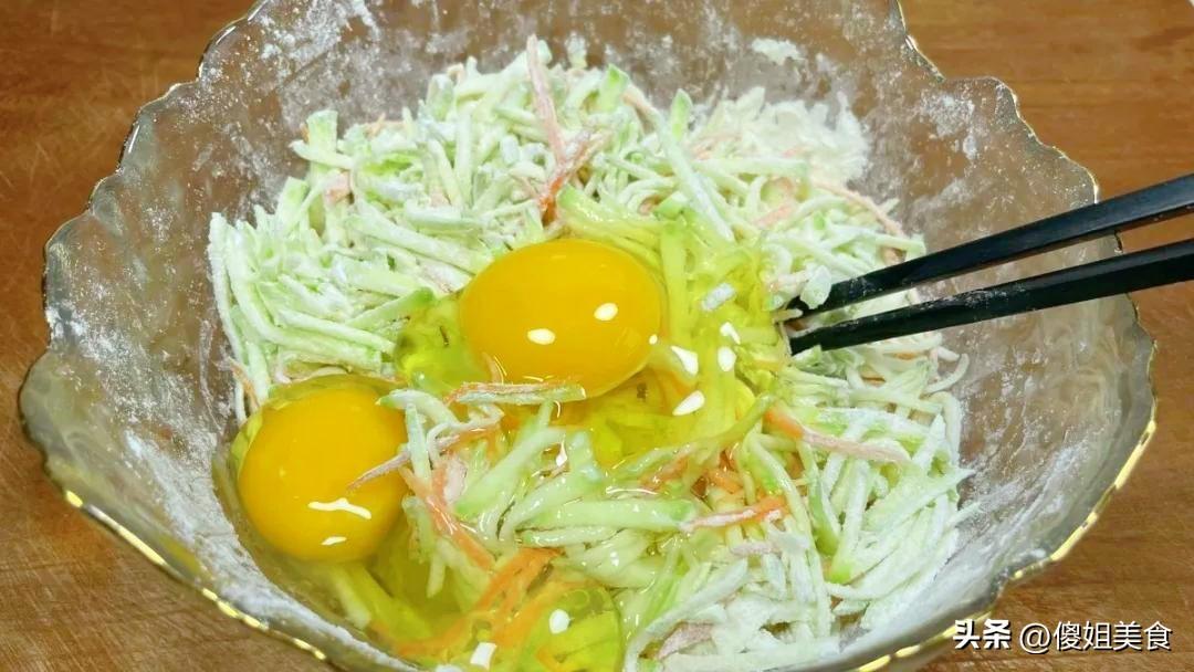 第二步:把西葫蘆絲和胡蘿蔔絲放在一個大碗裏,打入兩個雞蛋,加點鹽(如果之前西葫蘆已經用鹽醃過,這裏就少放點),再滴幾滴香油。然後慢慢加入麪粉,一邊加一邊用筷子攪拌。