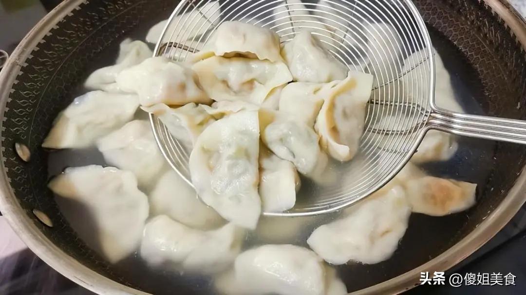 第五步:鍋中水開後下餃子,用勺子輕輕推動防止粘底。水再次沸騰後加入半碗涼水,如此反覆加三次涼水,待餃子全部浮起,變得白白胖胖的,就可以撈出來了。