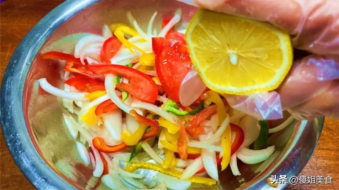 把切好的洋蔥、彩椒和西紅柿全部放進一個大碗裏,擠上半個檸檬的汁,再加一小勺鹽,滴幾滴香油,用手輕輕抓勻就好了。