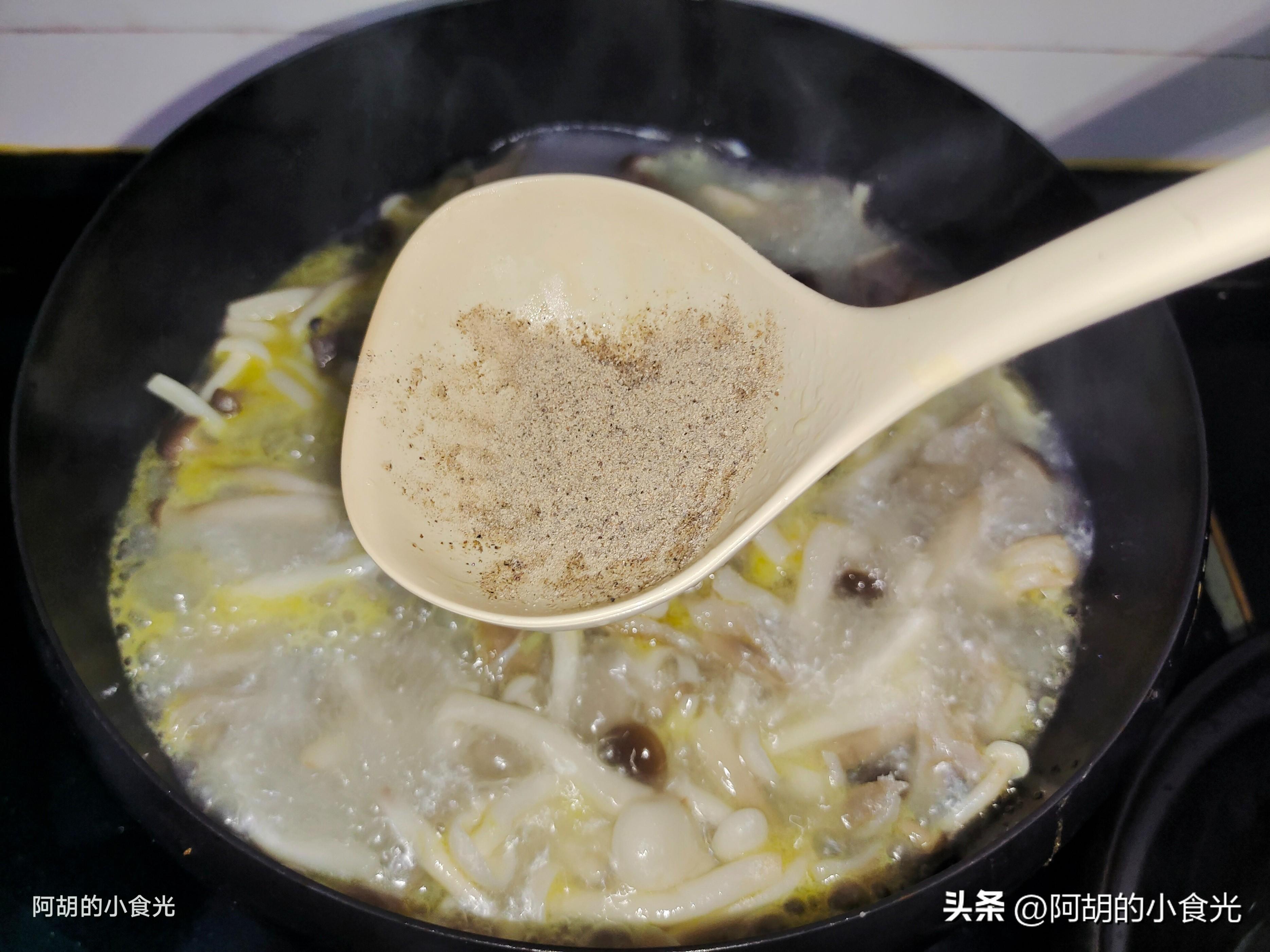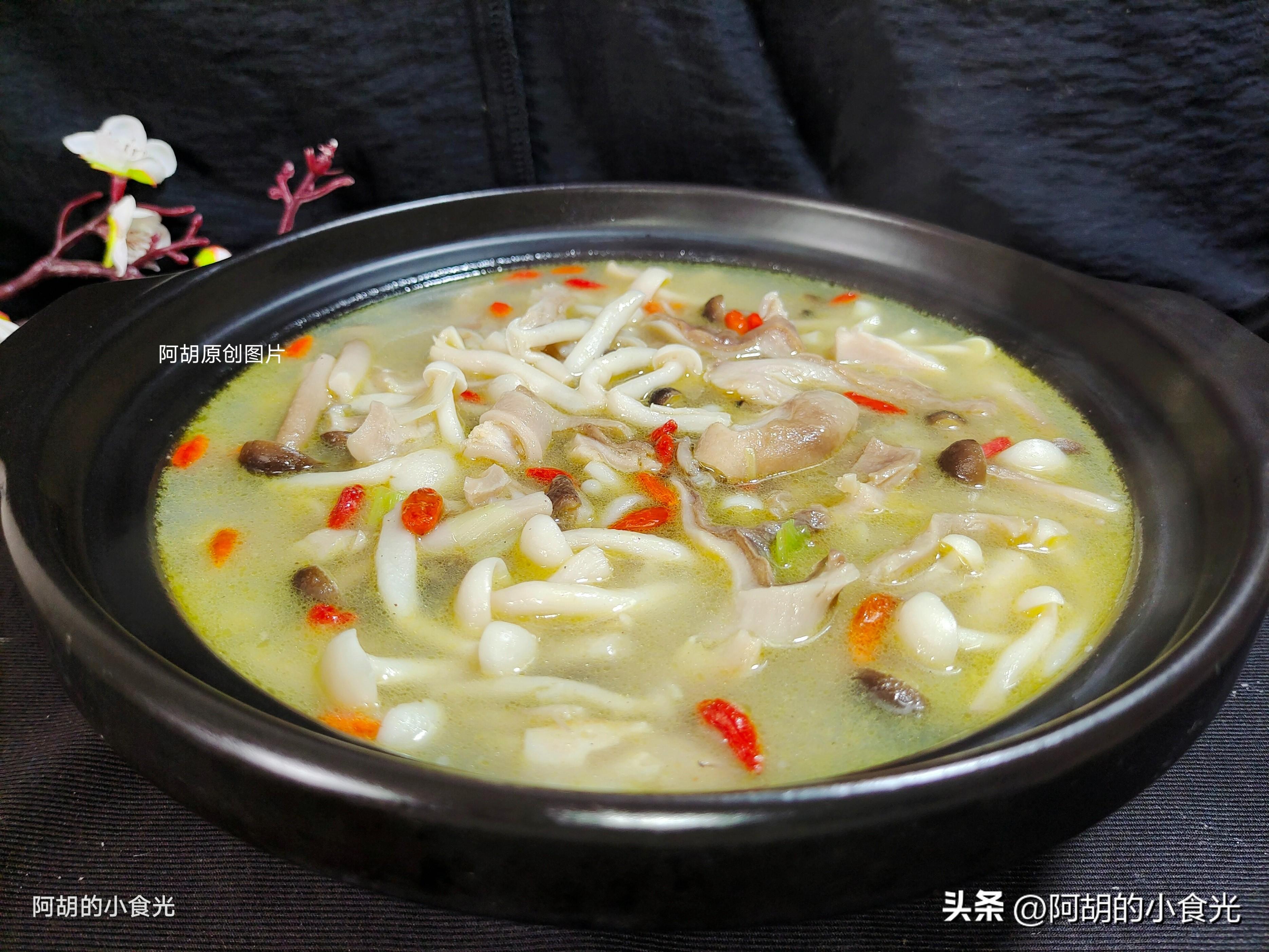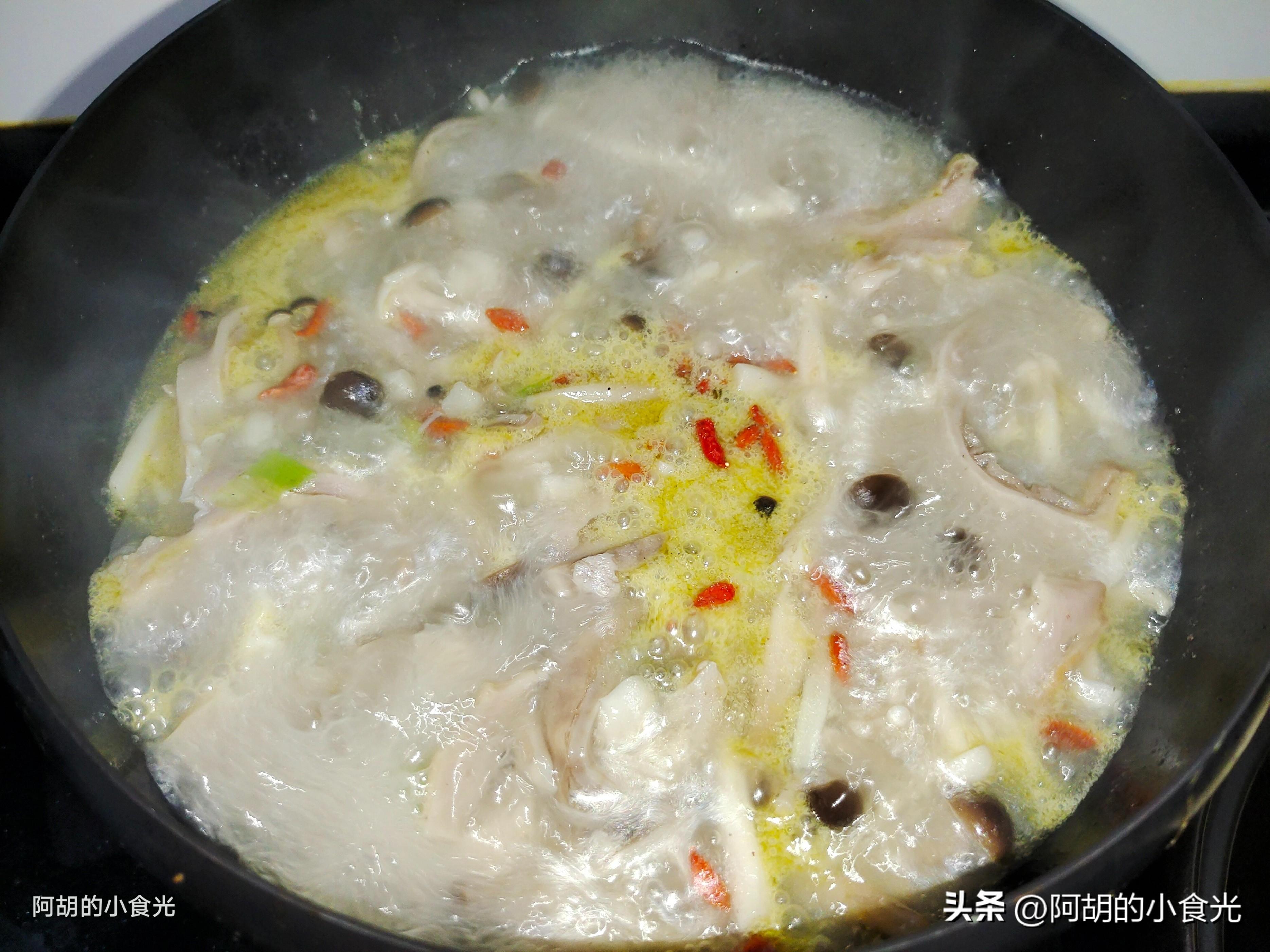 第四步:把高壓鍋中剩下的豬肚湯倒入鍋中(沒有豬肚湯的就加入開水),大火將其煮開後加入多一些的白胡椒粉,適量的食鹽調味,繼續燉煮五六分鐘左右,最後撒入一些枸杞點綴一下就可以出鍋裝盤了。鮮爽開胃,胡椒味道和豬肚湯簡直就是絕配,提味又爽口,兩種蘑菇自帶鮮香味,爲這道湯又增添不少色彩,天冷的時候煲一鍋,暖身開胃又營養,感興趣的一定要試一試這個做法。