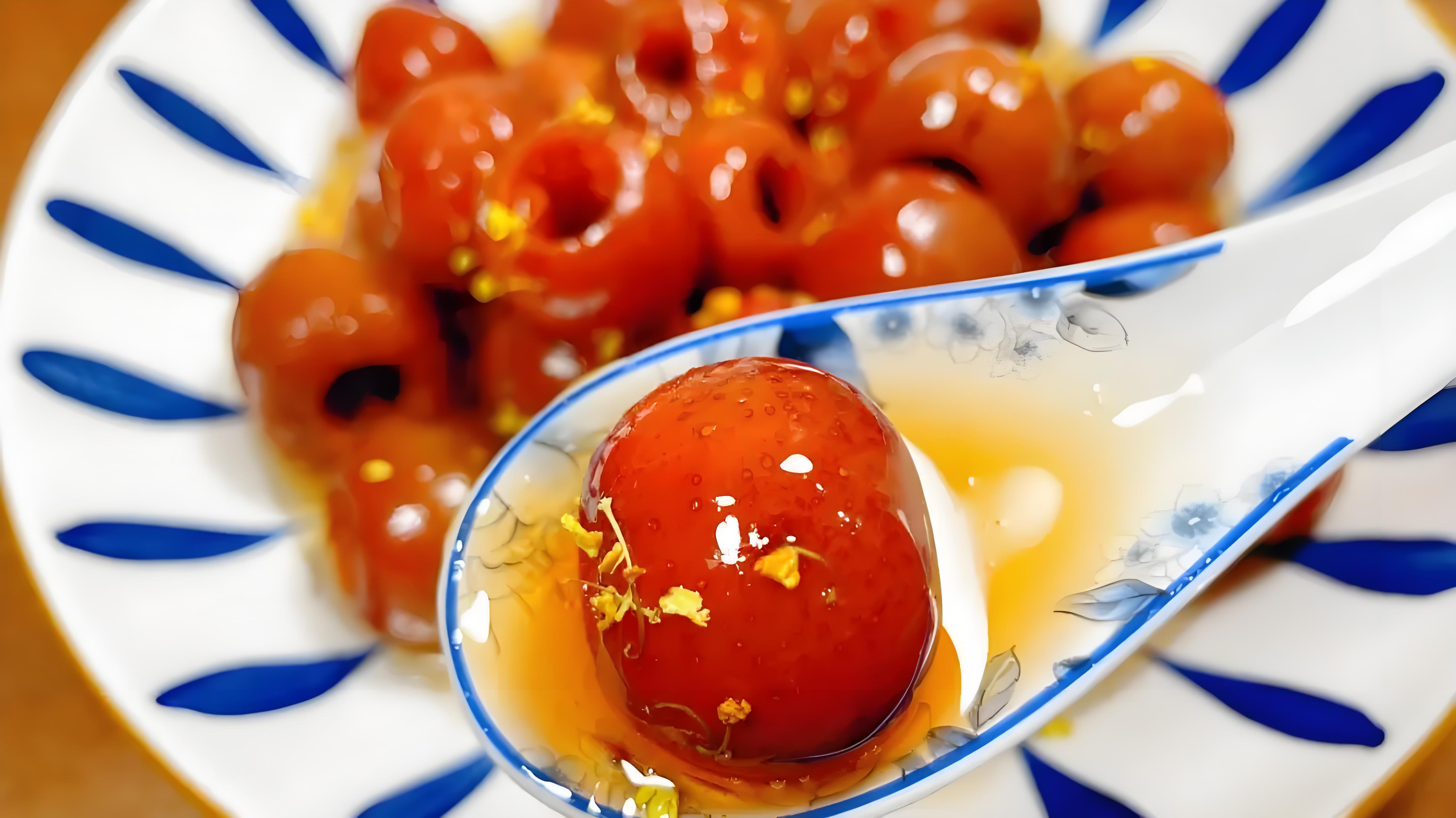 5. 把煮好的山楂用筷子夾出來裝盤,最後撒上一點幹桂花,這道糖漬桂花山楂就完成啦!