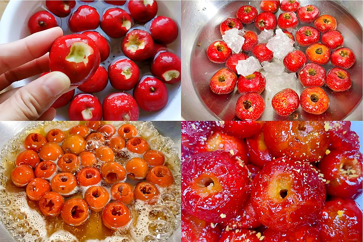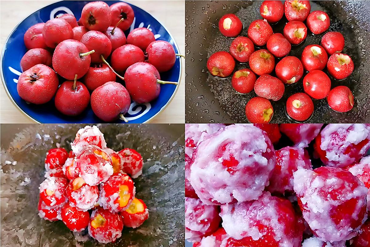 5. 隨着糖液溫度下降,你會看到白糖開始在山楂表面結晶,形成白色的糖霜,直到每顆山楂都裹滿了雪白的糖衣,這道掛霜山楂就大功告成啦!