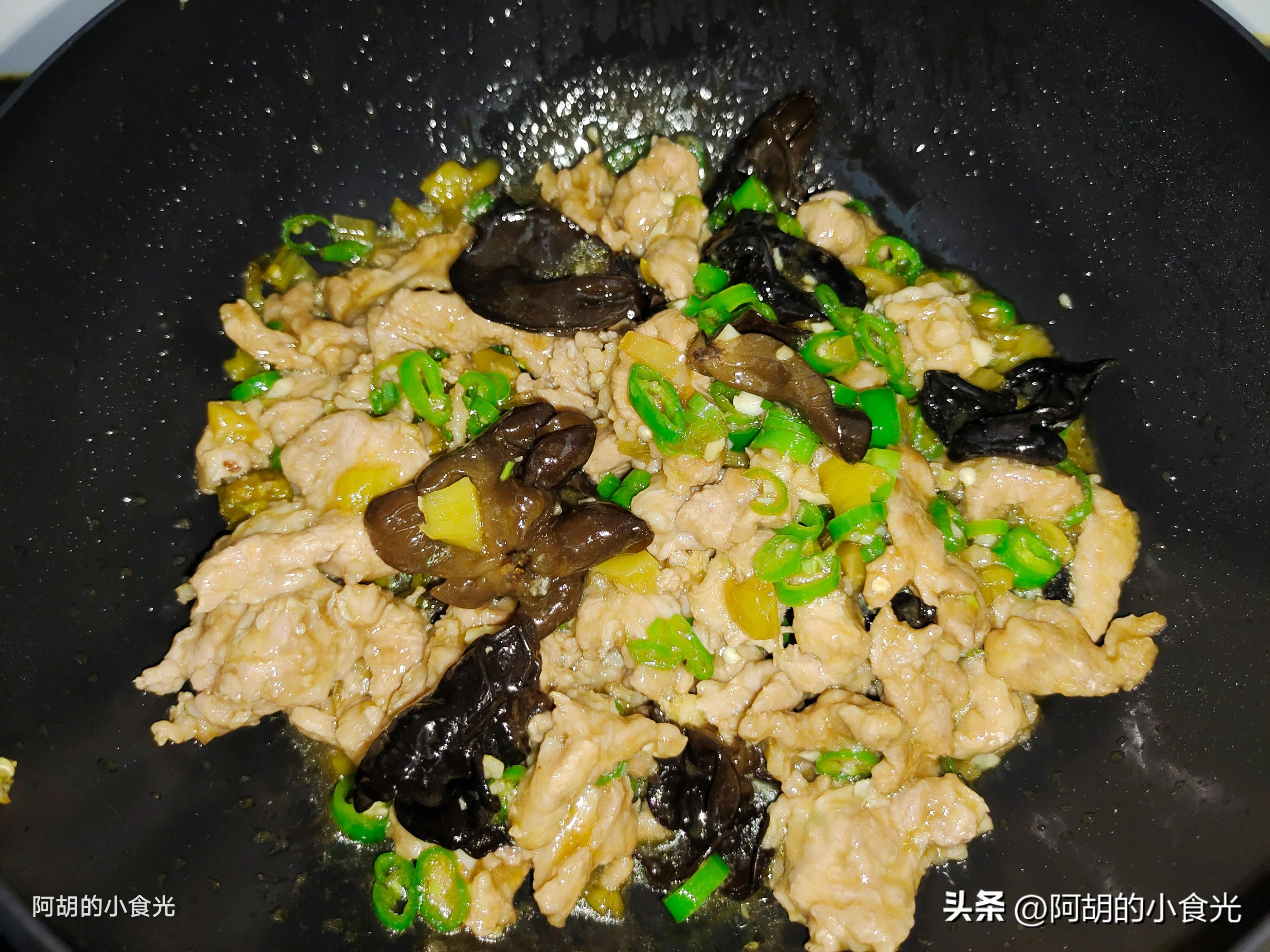 第五步:起鍋燒油,油熱後把青椒、酸菜和蒜末一塊倒入鍋中,保持大火快速滑炒幾下激發出香味,接着就把瀝乾水分的滑肉和木耳一塊倒入鍋中,先保持大火快速炒勻。