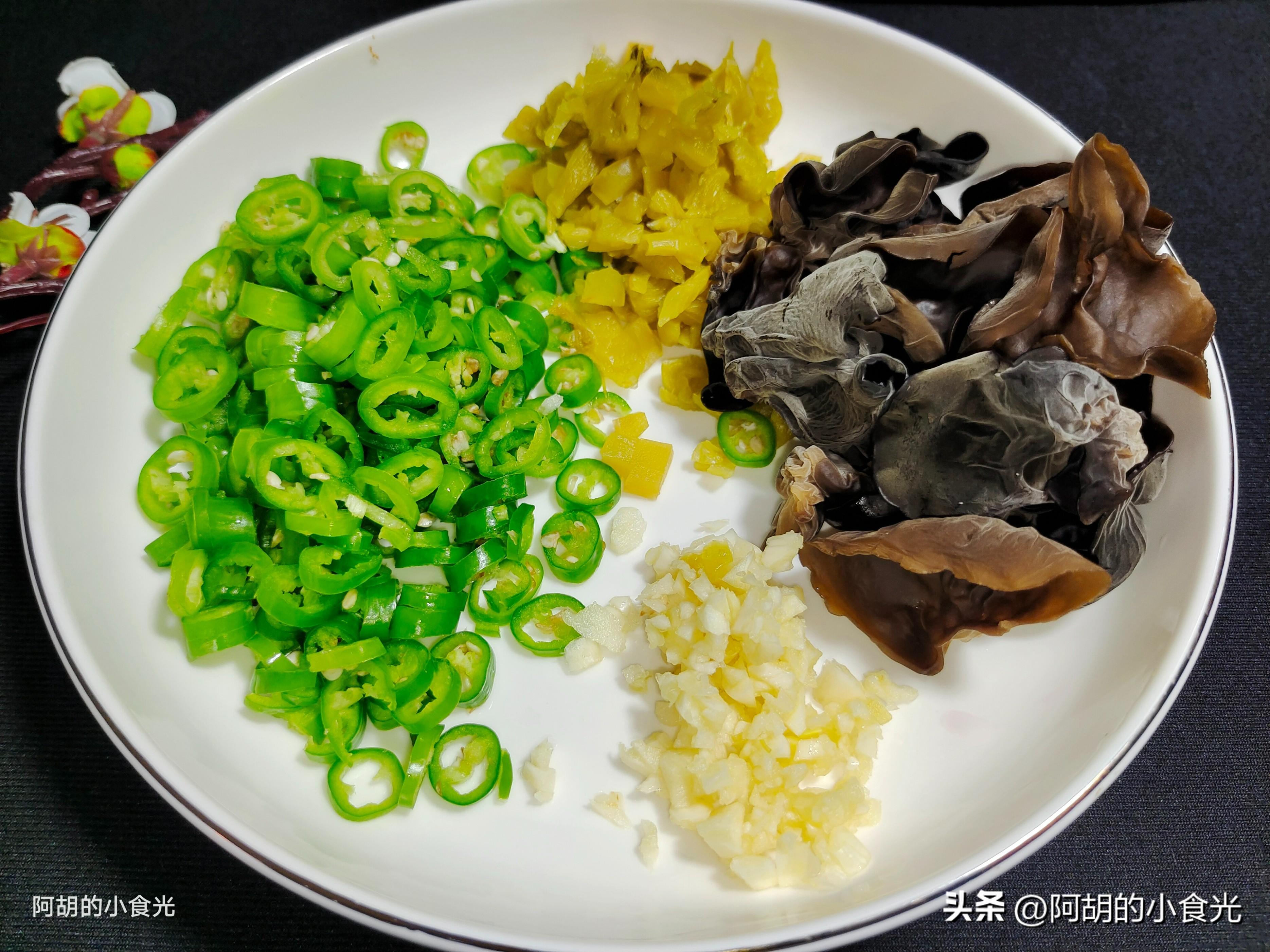 第四步:所需的主要配菜有靑線椒適量洗淨後切成小圈待用,少許的幹木耳充分泡發(焯水)後待用,再來一些酸菜切成小丁,此處用的是酸菜梗,一把蒜末也要備好。這裏還有一個“碗汁”也要提前備好,空碗中加入少許的清水,來半湯匙的幹澱粉攪勻,而後分別加入生抽3湯匙、蠔油一湯匙、食鹽和雞精適量攪勻即可。