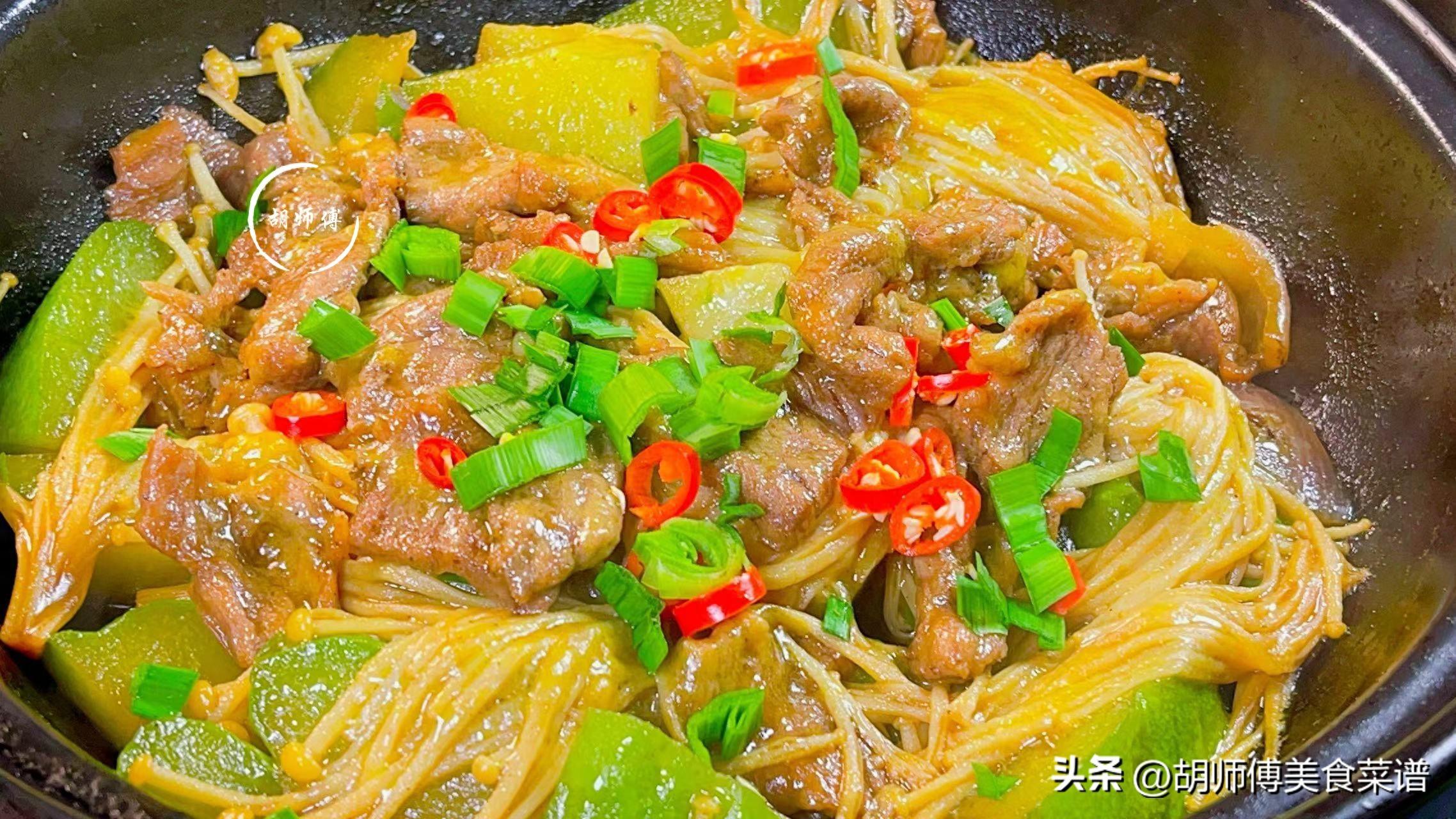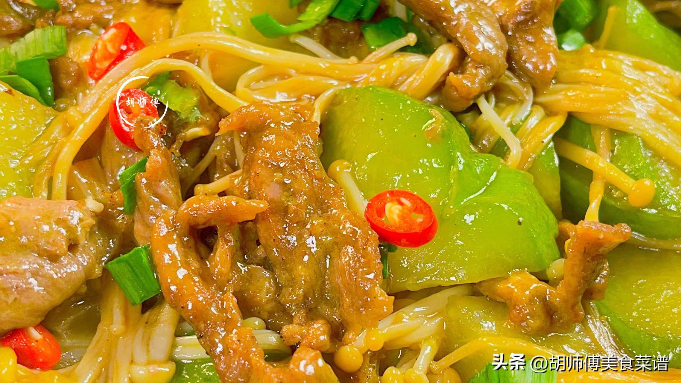 【食材準備】:佛手瓜2個、牛肉100克、金針菇150克、洋蔥20克、大蒜10克、小米椒、澱粉、蒜末、生抽、老抽、蠔油、食用油、清水適量。