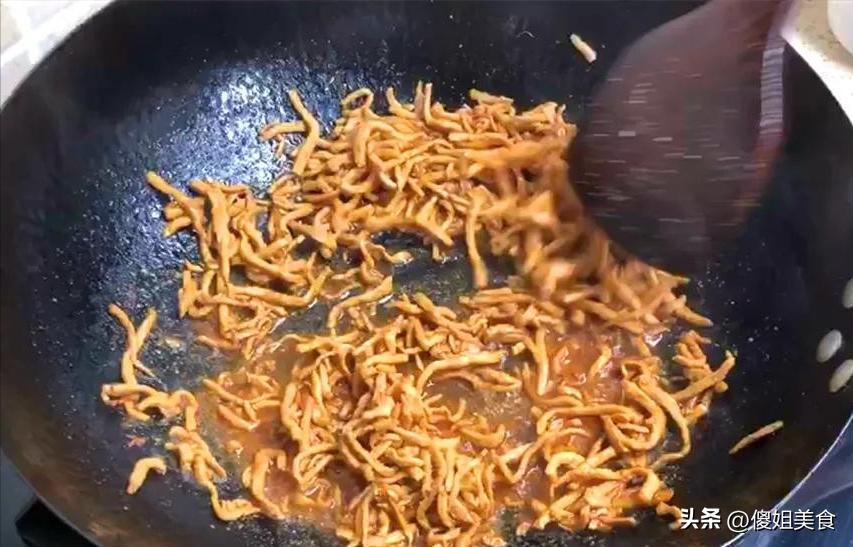 3、鍋裏放油燒熱,下肉絲快速劃散,炒到變色微微發黃,淋上一點味極鮮提鮮增香。