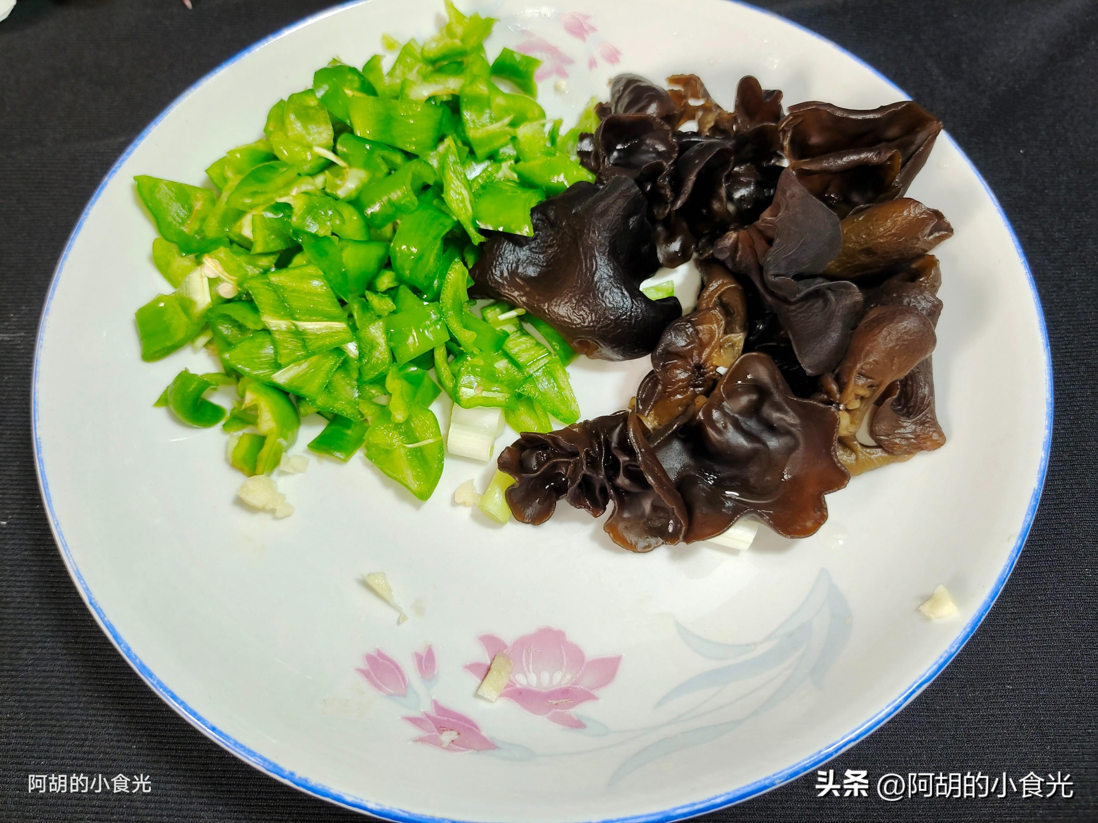 第二步:準備的主要配菜就是青椒,剖開去籽後將其切成小片狀備用。再來少許的木耳泡發後待用。還有一些蔥蒜用作小料使用,喜歡辣味的可以適當在小料中添入一些紅米椒。