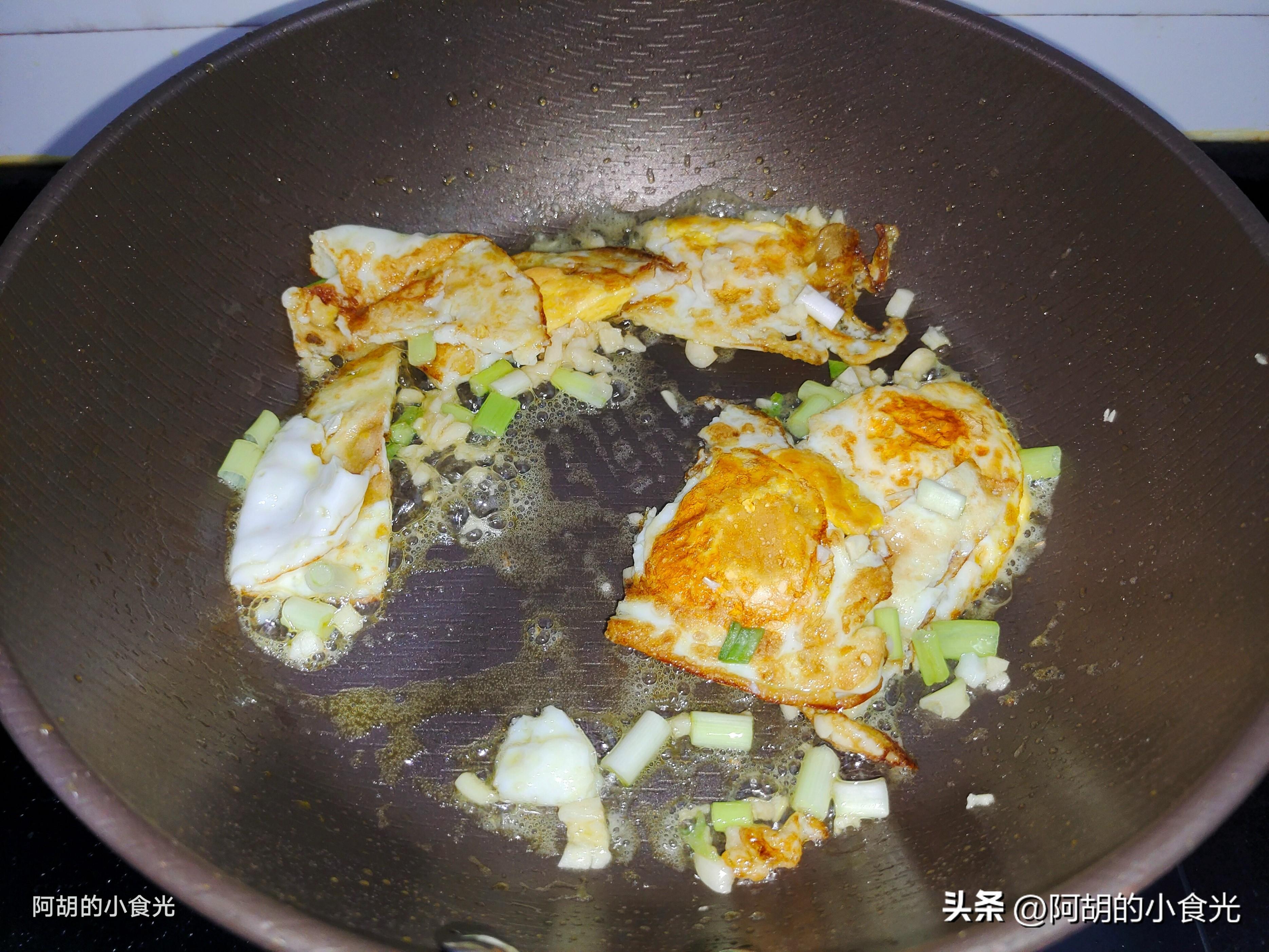 第三步:下面浸入烹飪主題,需要先來煎荷包蛋。鍋燒熱後淋入一些菜籽油和少許的豬油混合,小火燒熱後將三個雞蛋打入鍋中,煎至兩面金黃的時候用鏟子將其切開成大塊,而後把小料蔥蒜倒入鍋中炒出香味。