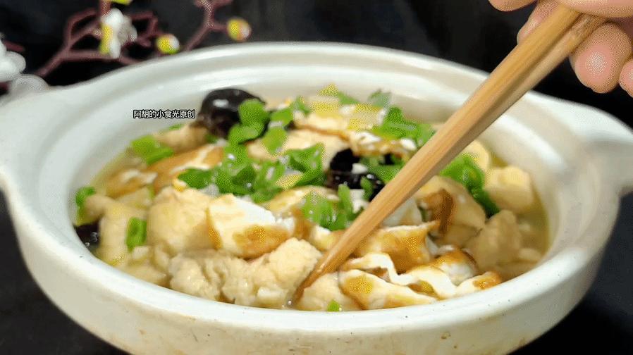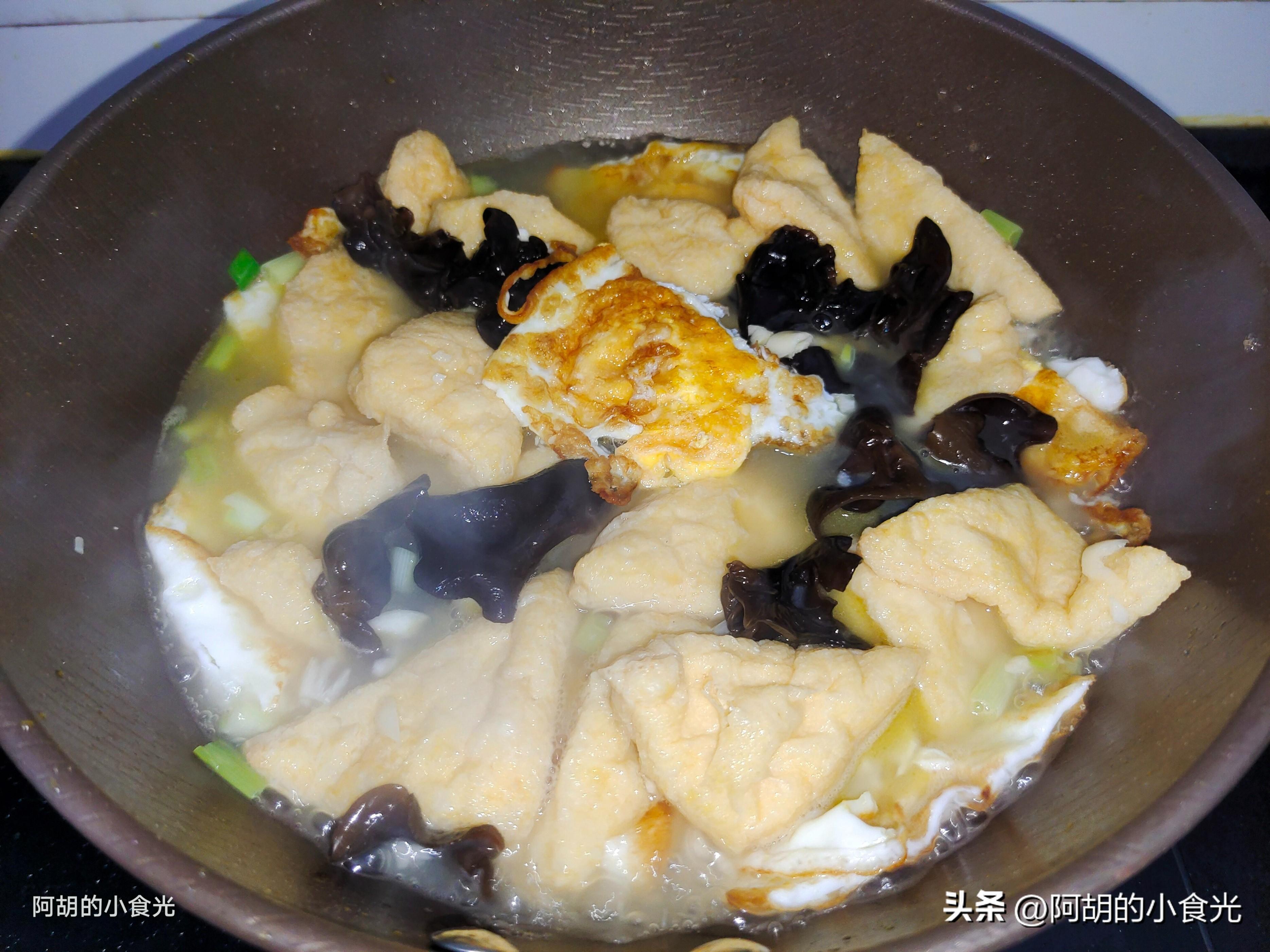 第四步:鍋中炒出香味後直接用開水衝入鍋中,轉爲最大火煮一煮,讓其湯色泛白。而後把油豆腐和木耳也倒入鍋中,保持大火煮,撒入一些食鹽、少許胡椒粉和雞精調味,而後加蓋燜煮個兩三分鐘左右,讓各食材味道滲出融合,同時讓油豆腐充分吸收湯汁的滋味。